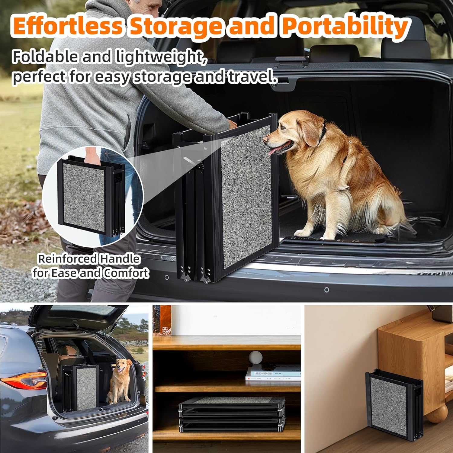 - 𝐄𝐚𝐬𝐲 𝐅𝐨𝐥𝐝𝐢𝐧𝐠 𝐟𝐨𝐫 𝐂𝐨𝐧𝐯𝐞𝐧𝐢𝐞𝐧𝐭 𝐒𝐭𝐨𝐫𝐚𝐠𝐞 𝐚𝐧𝐝 𝐓𝐫𝐚𝐧𝐬𝐩𝐨𝐫𝐭: Featuring a four-fold design, the dog car ramp is not only sturdy but also lightweight and easy to fold. Whether you’re heading on a long road trip or a quick outing, this ramp is your pet’s perfect travel companion, making transportation stress-free.