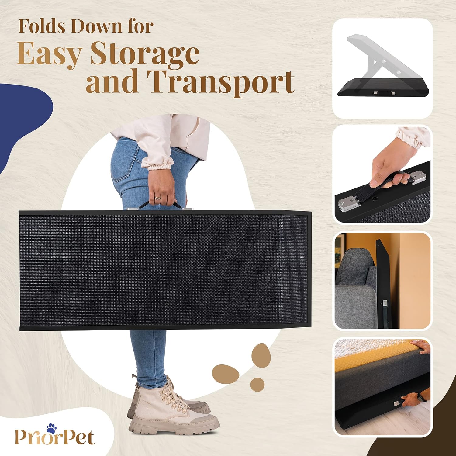 Además, en caso de que desee utilizar su rampa para perros en diferentes lugares o solo ocasionalmente, nos hemos ocupado de brindarle la mayor comodidad posible. La rampa para perros se pliega fácilmente a una altura de solo 2.8 in, por lo que es fácil de almacenar y transportar. Cuando está plegada, las dimensiones de la rampa son: L: 35.0 in x ancho: 14.2 in x altura: 2.8 in. También hemos añadido un asa de transporte a nuestra rampa para perros para una fácil portabilidad alrededor de la casa o cuando viajas.
