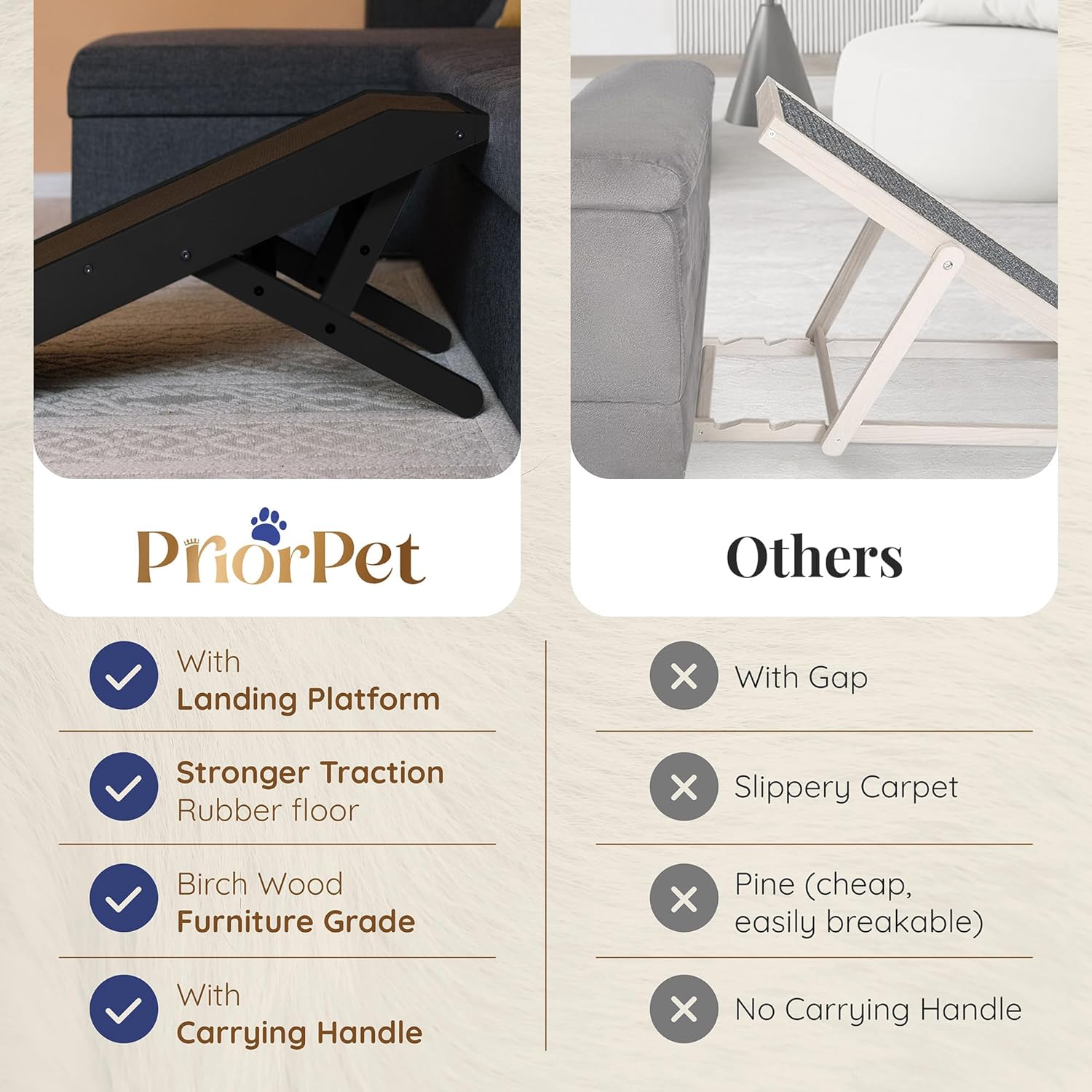Sin embargo, no todas las rampas para perros son igualmente adecuadas para apoyarte a ti y a tu perro. Muchas rampas disponibles en el mercado están hechas de madera de pino barata, que no soporta mucho peso y no es duradera. Nuestra rampa para perros PriorPet, por otro lado, está hecha a mano con hermosa madera de abedul sólida de grado de muebles que es más fuerte que la mayoría de las otras maderas. Esto permite que nuestra rampa admita perros grandes y pesados con un peso máximo de 176.4 lbs. Además, su aspecto elegante y 5 variaciones de color diferentes hacen que se adapte perfectamente a tu hogar como un mueble.
