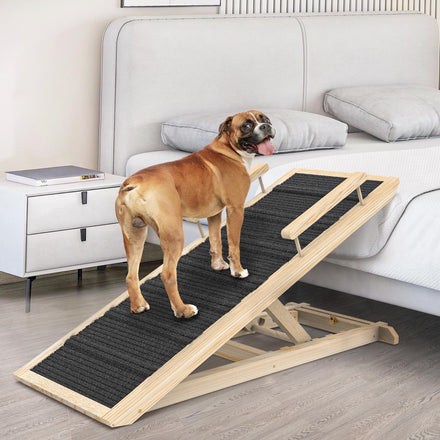 - Excelente servicio al cliente: el uso de la rampa para perros para automóvil puede hacer que la mascota vaya fácilmente al sofá, cama, caravana, evitando tensiones musculares y articulares causadas por saltos, lo que te permite a ti y a tu mascota disfrutar del tiempo de juego. El diseño de color natural será fácil de integrar en cualquier estilo de hogar o cubrirá una alfombra de baño sobre la rampa para dar a mis mascotas un poco más de agarre. Advertencia: La parte superior de la escalera debe estar anclada de forma segura contra una superficie fija (cama/sofá) antes de su uso para evitar la inestabilidad.