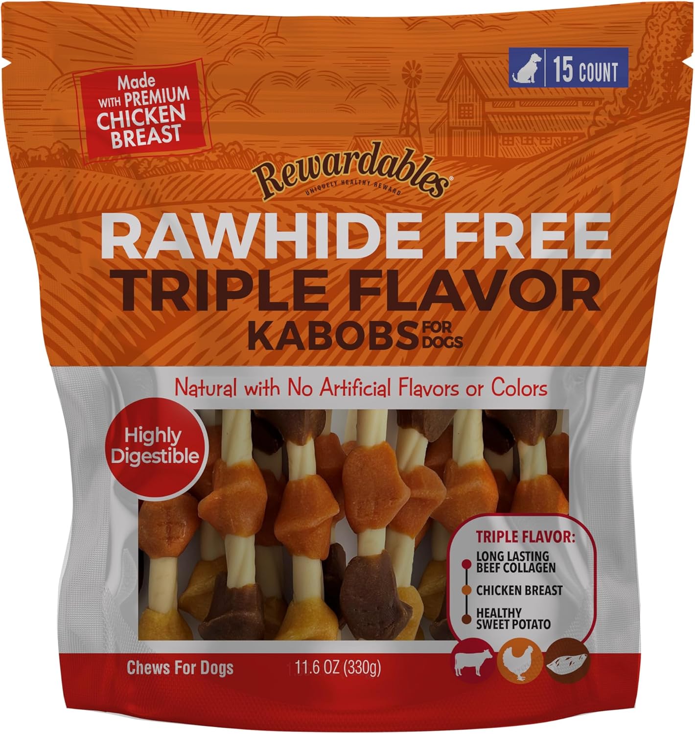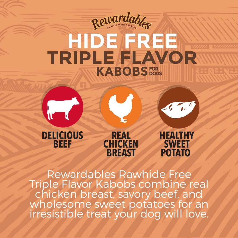 - EASILY DIGESTIBLE - Rewardables Triple Flavor Kabobs are made with limited ingredients making them the perfect, safe and easily digestible chew for your dog.