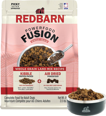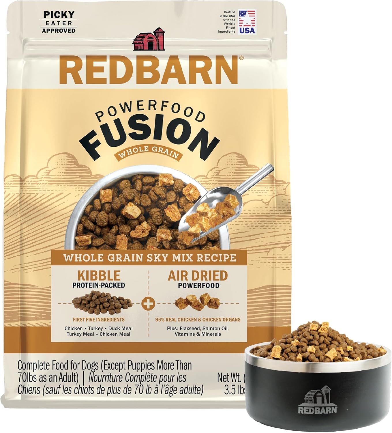 - NO HASSLE WHOLE GRAIN RECIPE: Formulated for all lifestages, Powerfood Fusion is a convenient alternative to raw or meal toppers with two premium foods in one bag. With Redbarn, every meal is more than just food – it’s a step toward a healthy, happy, and thriving life with your loyal companion.