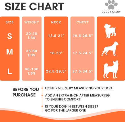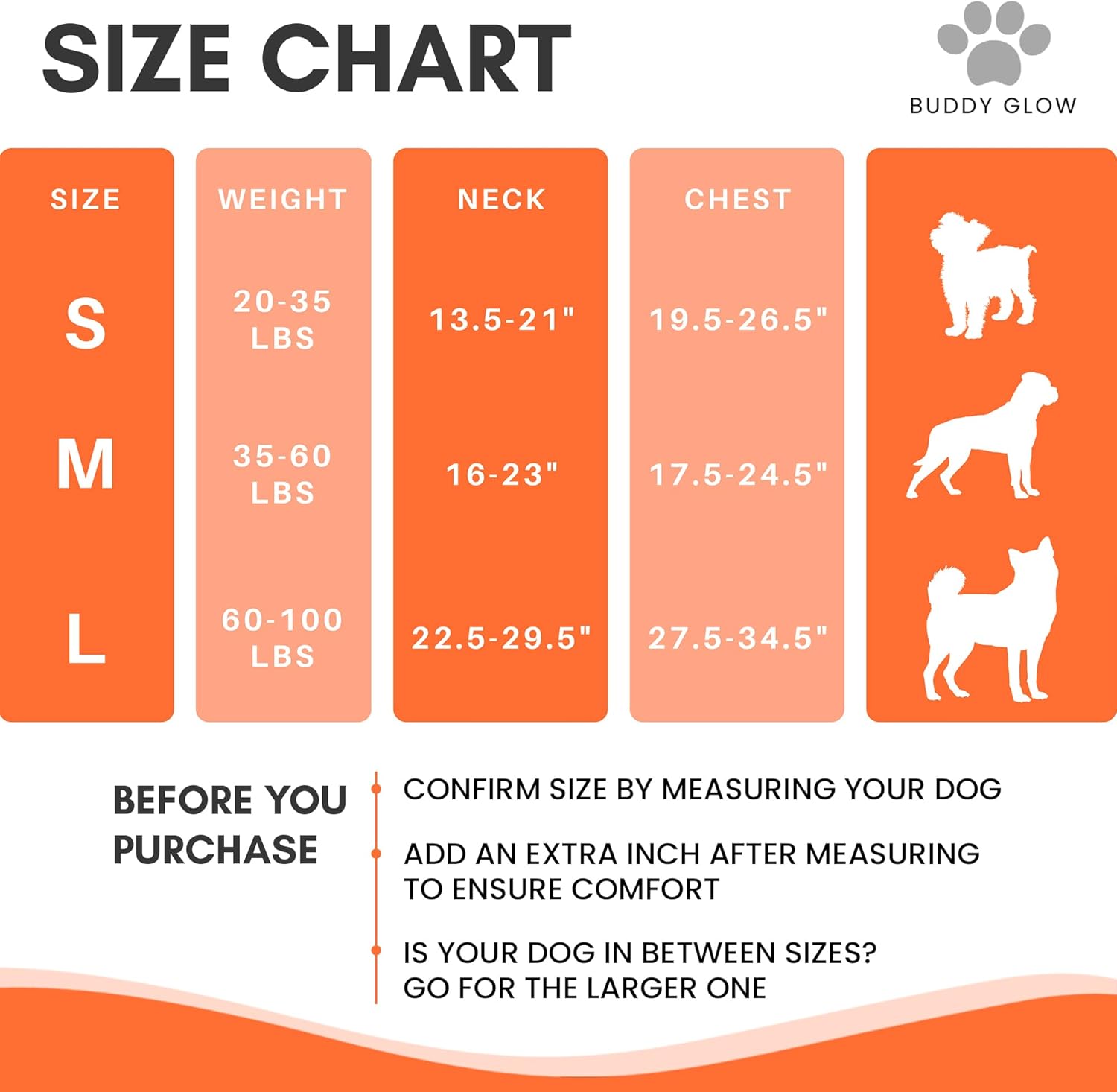 BUDDY GLOW vests feature extra-long Velcro straps with upto 8” of adjustability for a secure fit. Ideal for growing pups or layering. Check the size chart for neck and chest ranges.