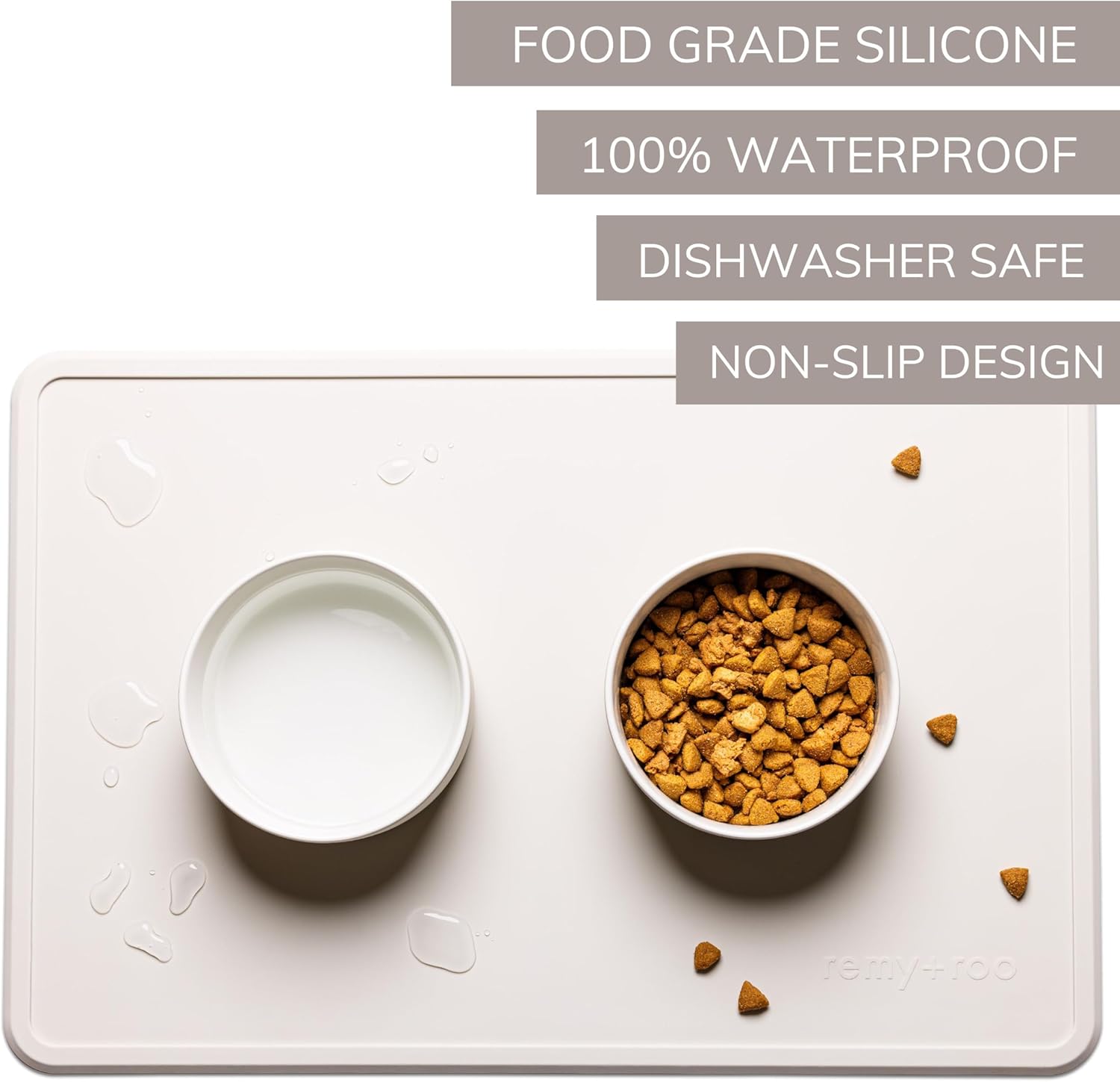 - PREMIUM QUALITY SILICONE: The Remy+Roo dog food mat is crafted from 100% food-grade silicone mat for dog bowls. This soft, flexible, and durable dog water mat provides a safe and comfortable spot for your dog to enjoy their meals or drinks. The dog feeding mat is designed to keep your floors clean and protected from spills.