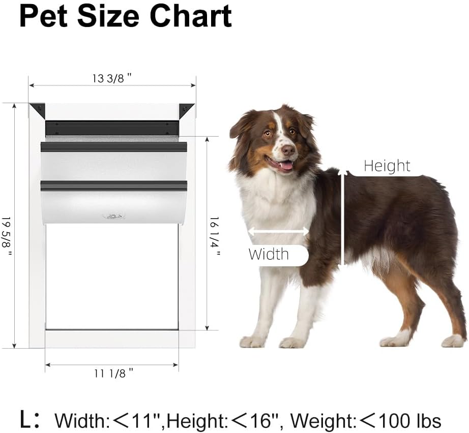 - 【DIMENSION & TELESCOPING WIDTH】The large dog door frame size is 13 3/8''(W) x 19 5/8''(H), Cutting size is 12 1/8'''(W) x 18 1/2''(H), Flap opening is 11 1/8”(W) x 16 1/4''(H). It fits paneled, wood, PVC, and metal doors 1 3/8'' - 2 1/8'' thick.