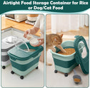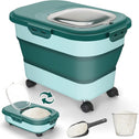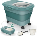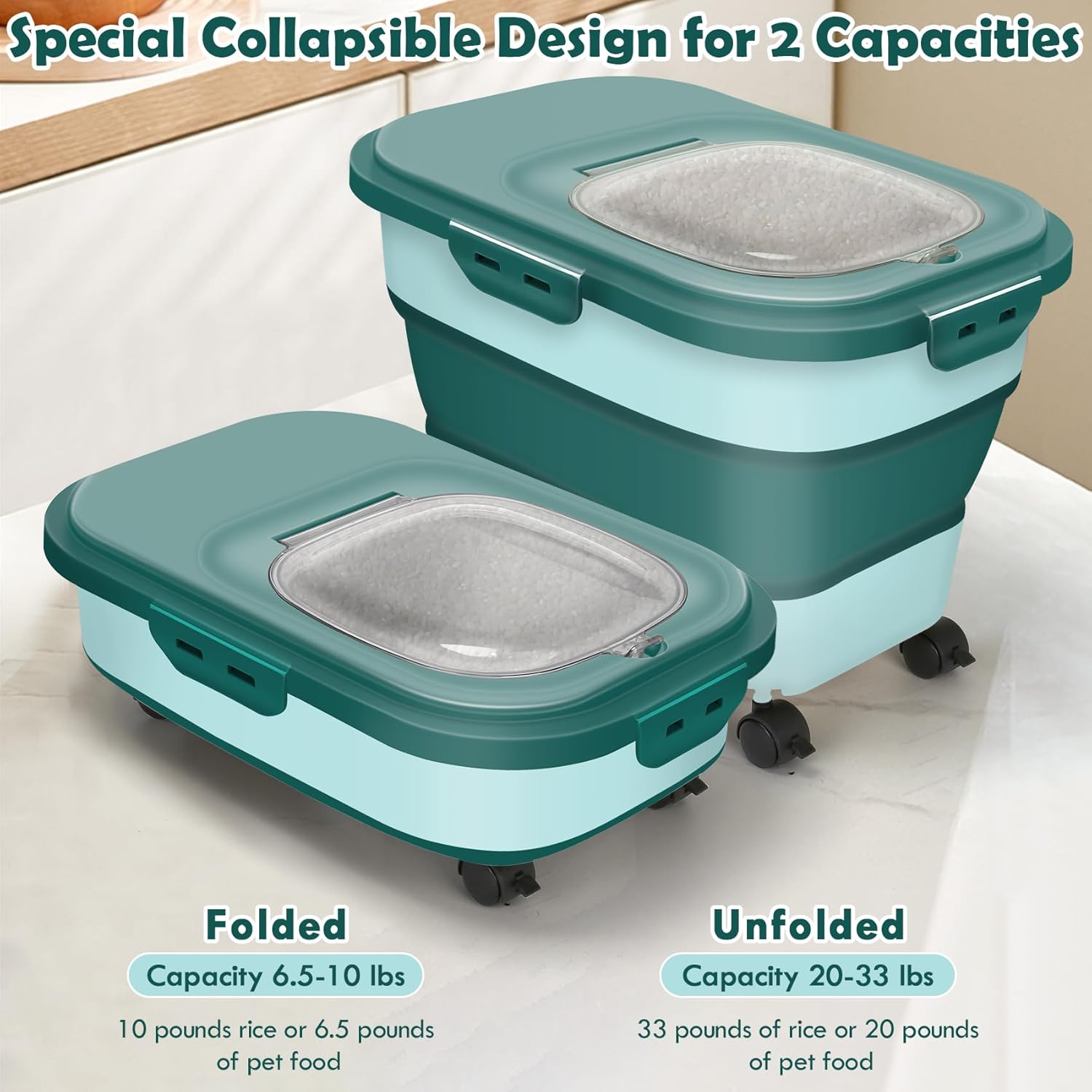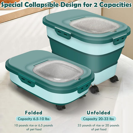 - Portable & Space-Saving: The pet food storage bin comes with rolling wheels for easy mobility. Folded it to store on a shelf or attatch the wheel to roll it from the storage area to your dog or cat bowl. When unfolded, it can store about 33 lbs of rice or 20 lbs of pet food. When folded, it can store about 10 lbs rice or 6.5 lbs of pet food