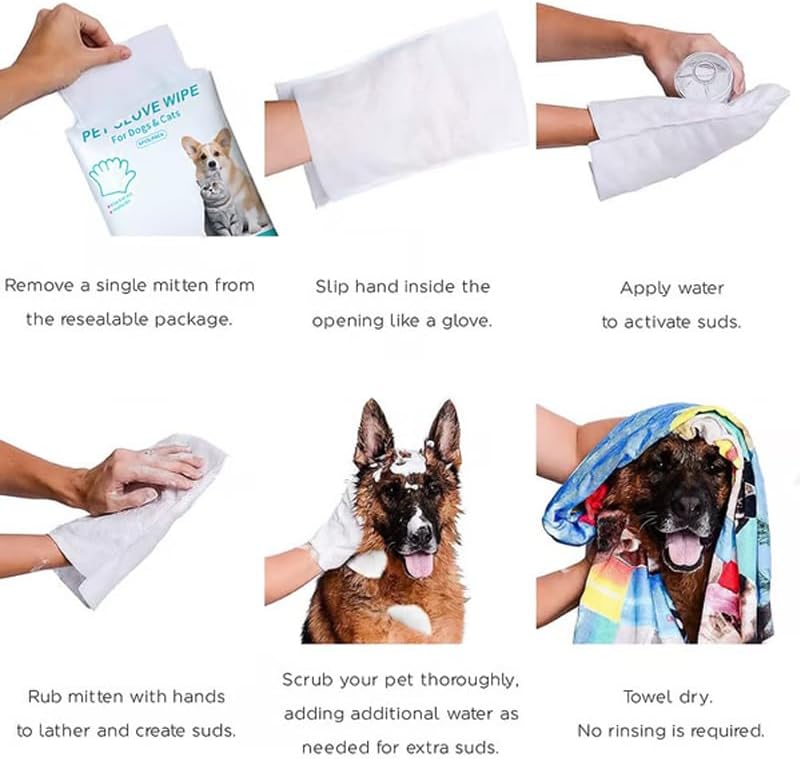- 🚗 Portable & Fresh Packaging – Designed with a resealable pouch, these rinse free dog wash shampoo mitts stay moist and ready wherever you go. Perfect for quick cleanups after hikes, road trips, or outdoor fun, the compact size fits easily into bags, ensuring your pet stays clean and fresh anytime.