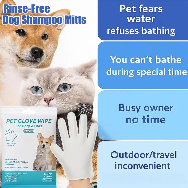 - 🐾 Quick & Easy Bath Time – With Rinse-Free Dog Shampoo Mitts, you can give your furry friend a refreshing clean in minutes. Just add water, rub to build a rich foam, and wipe away dirt. These rinse free shampoo mittens for dogs make bath time stress-free, perfect for after walks, playdates, or rainy days when a full bath isn’t possible.
