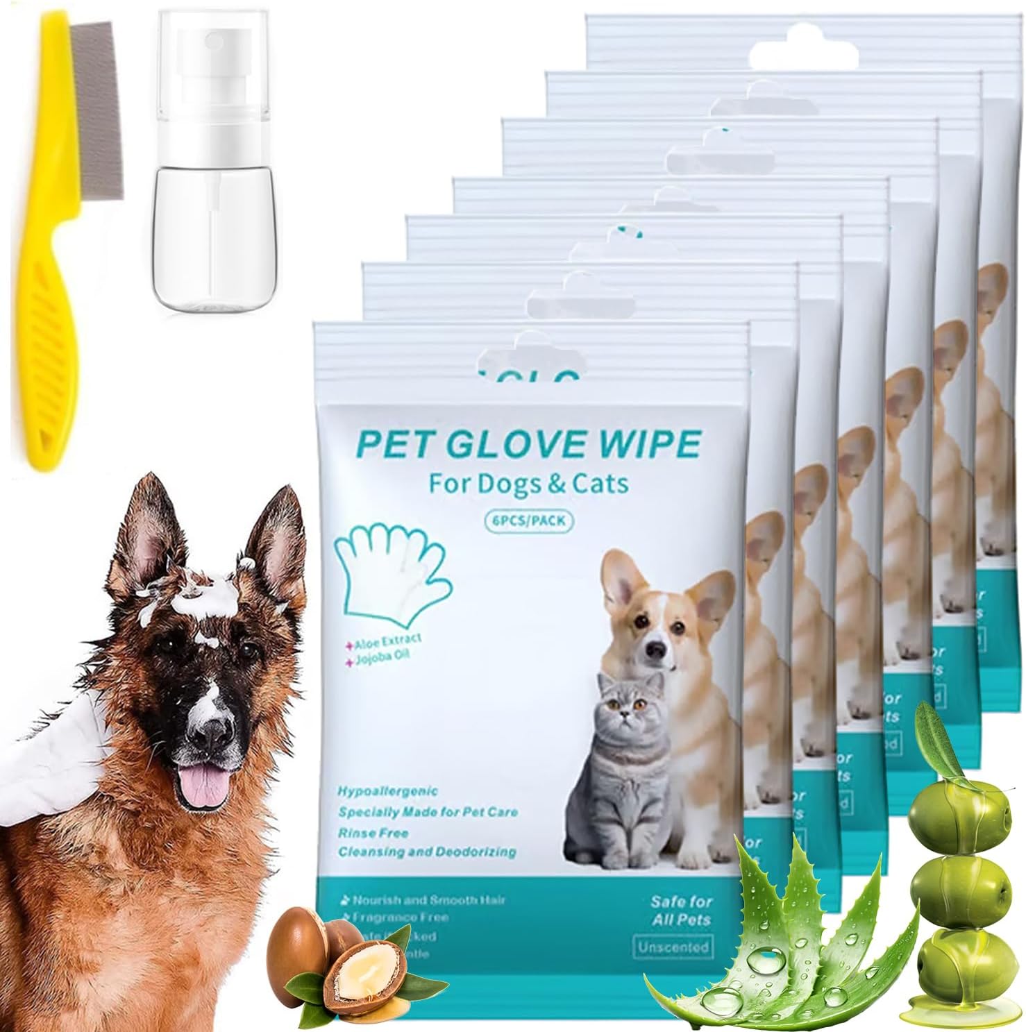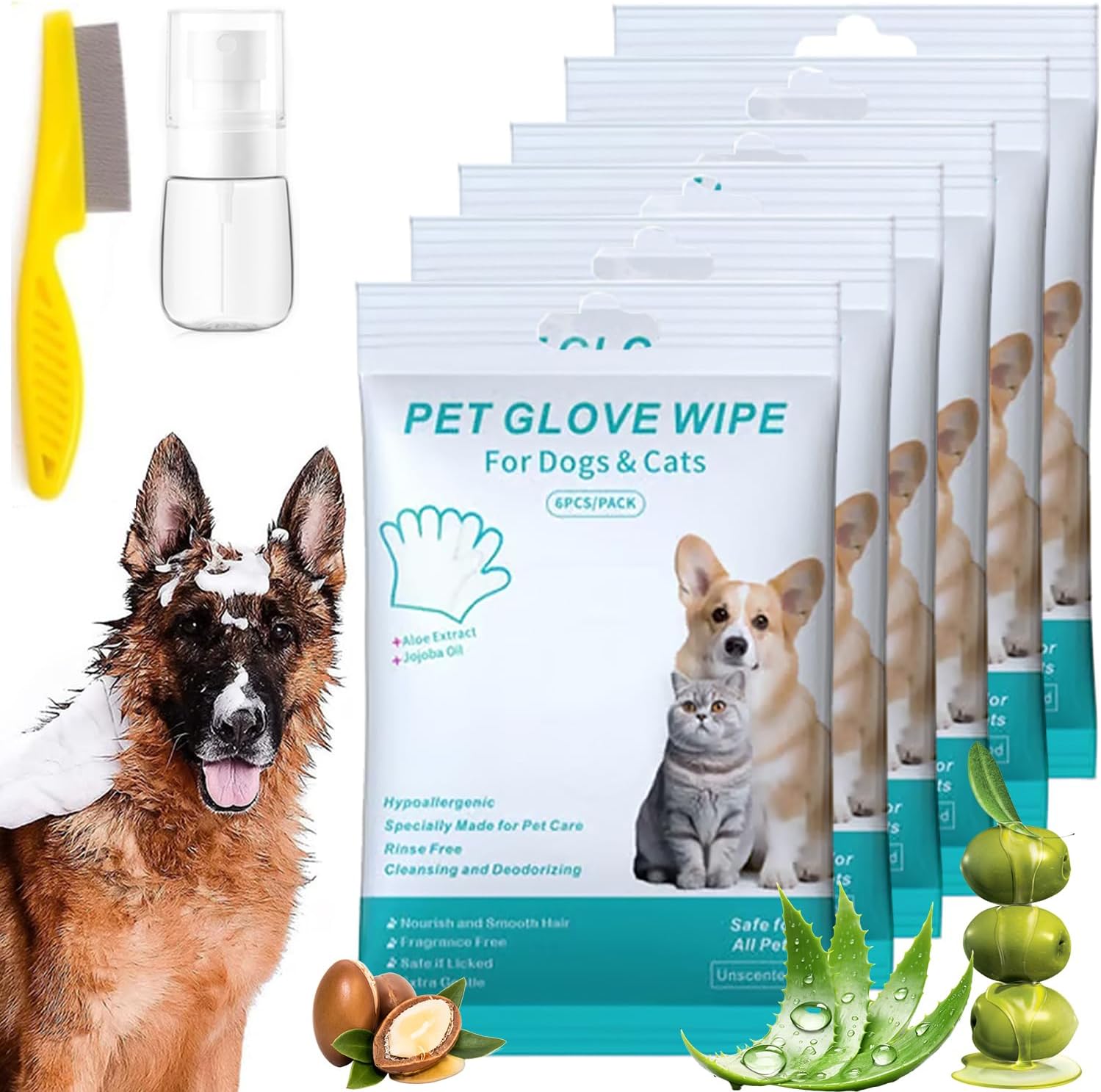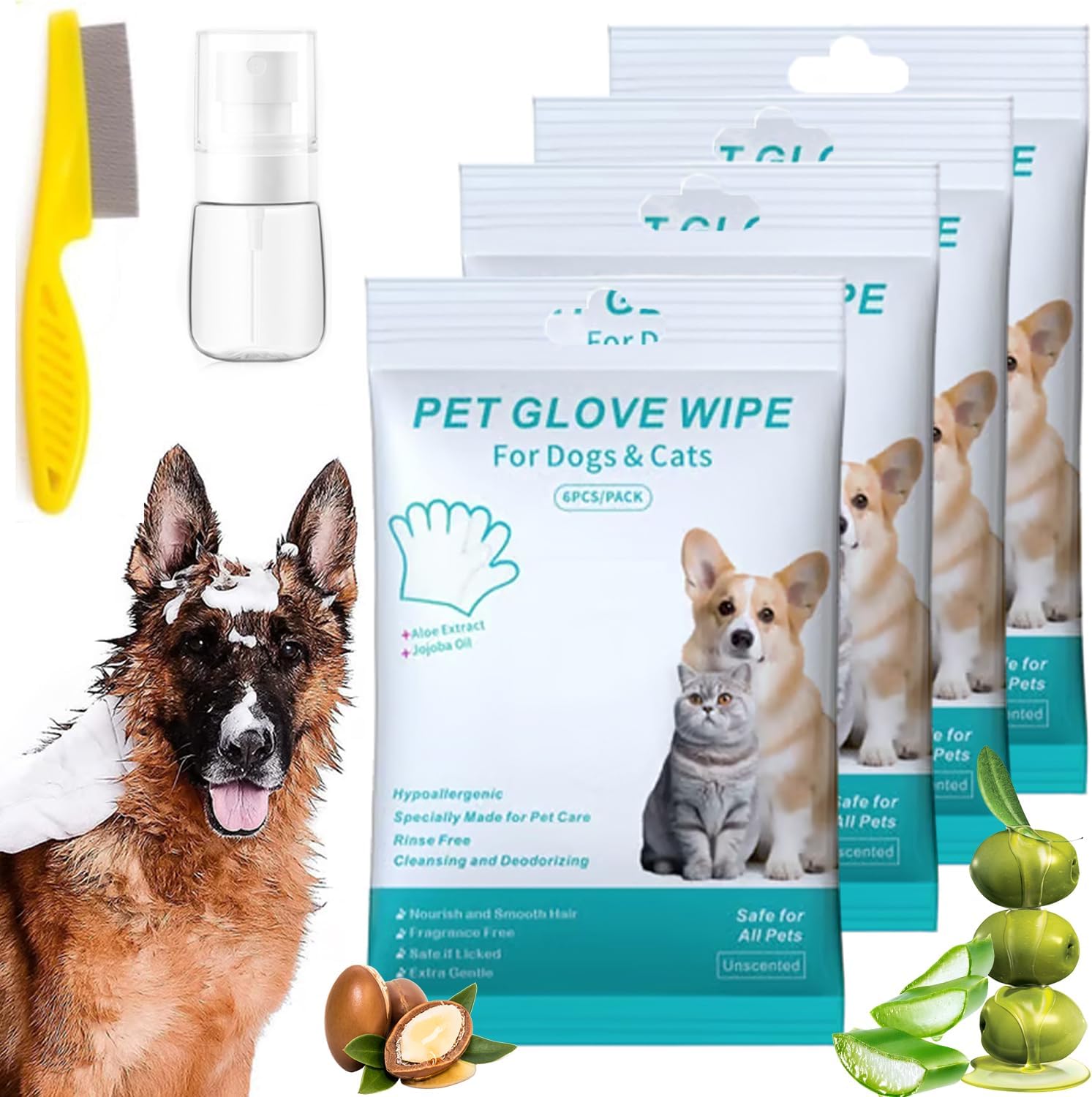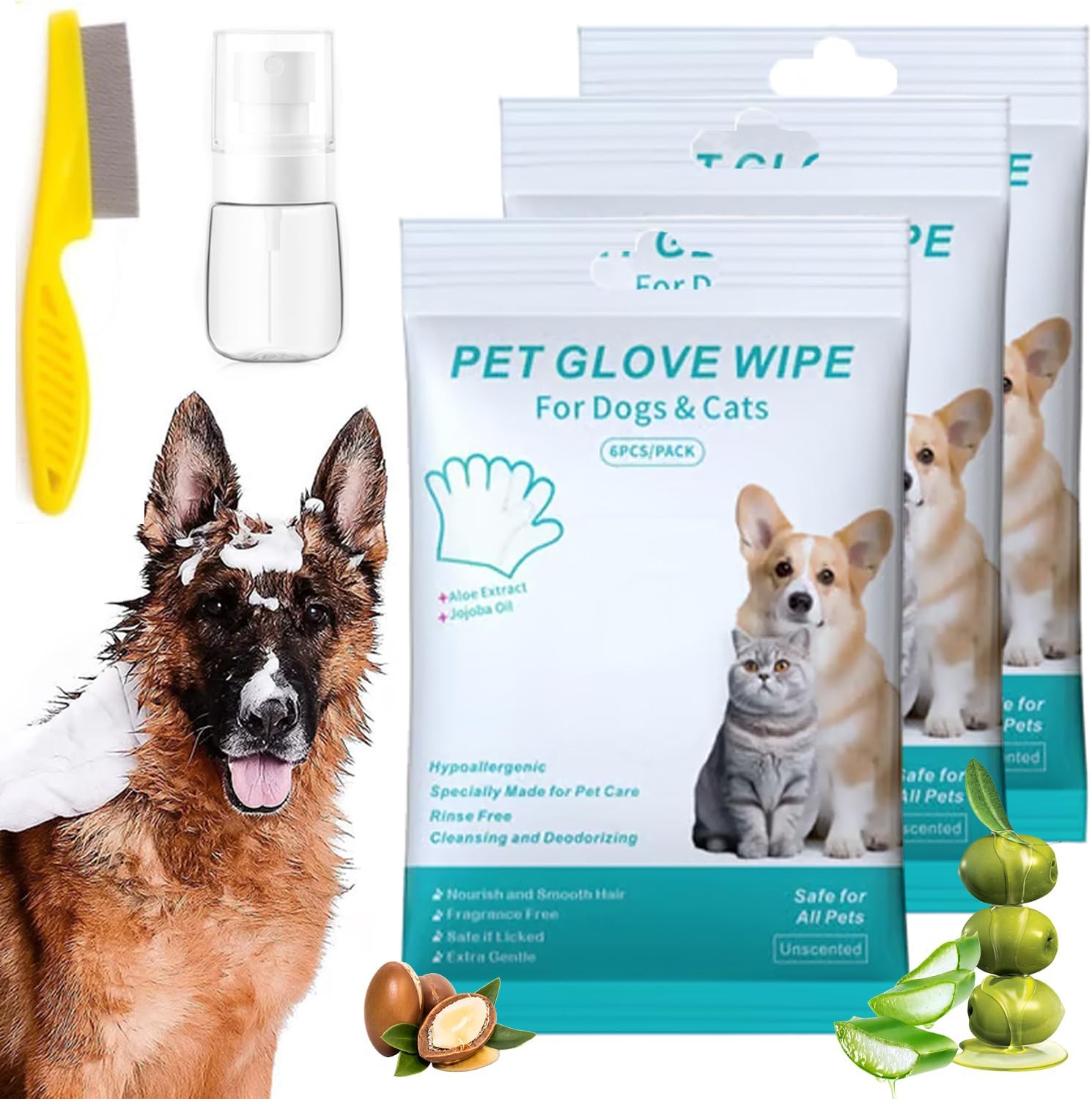 - 🌿 Gentle Ingredients – Enriched with aloe vera, tea tree, and glycerin, these rinse free dog wash shampoo mitts are designed to soothe skin while nourishing fur. The gentle formula supports coat health and helps keep your pet smelling fresh.