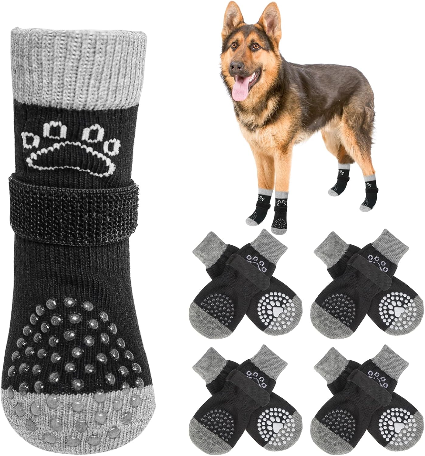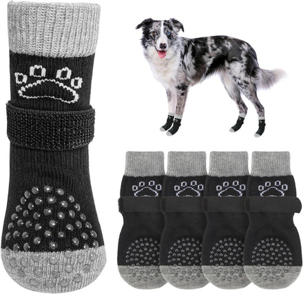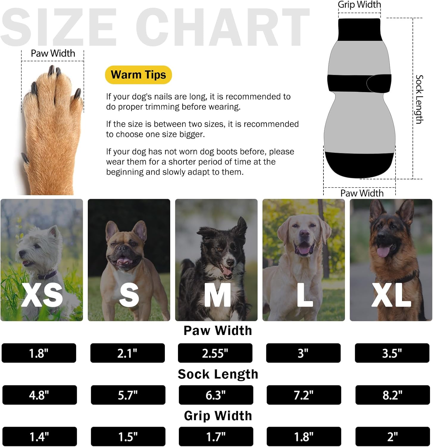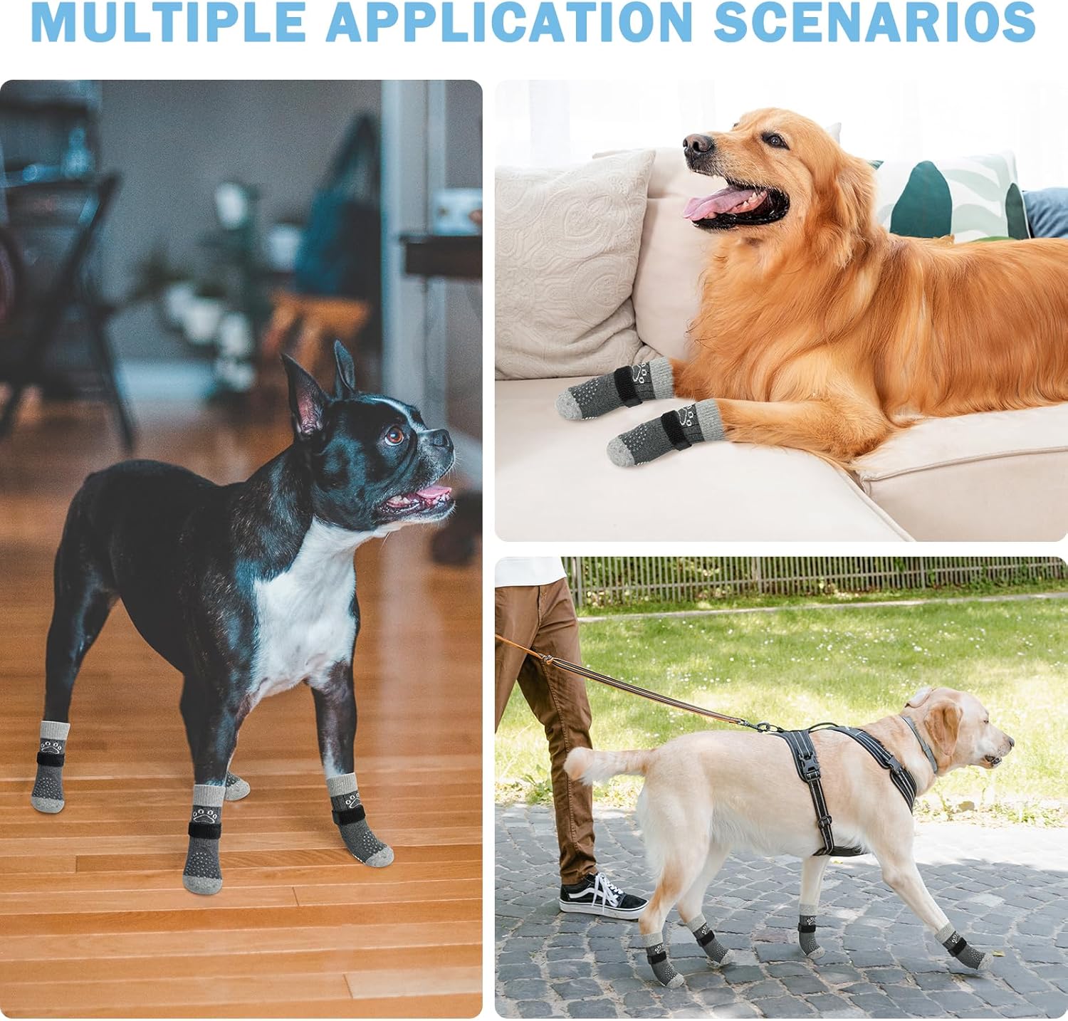 MULTIFUNCTIONAL ANTI-SLIP DOG SOCKS: The anti-slip socks for dogs are the perfect solution to slippery hardwood floors, burning pavement and furniture damaged by dog paws. In addition to providing better traction and protecting your dog's feet from injury, it also prevents your dog from licking and irritating wounds, further aiding in the healing of foot wounds.