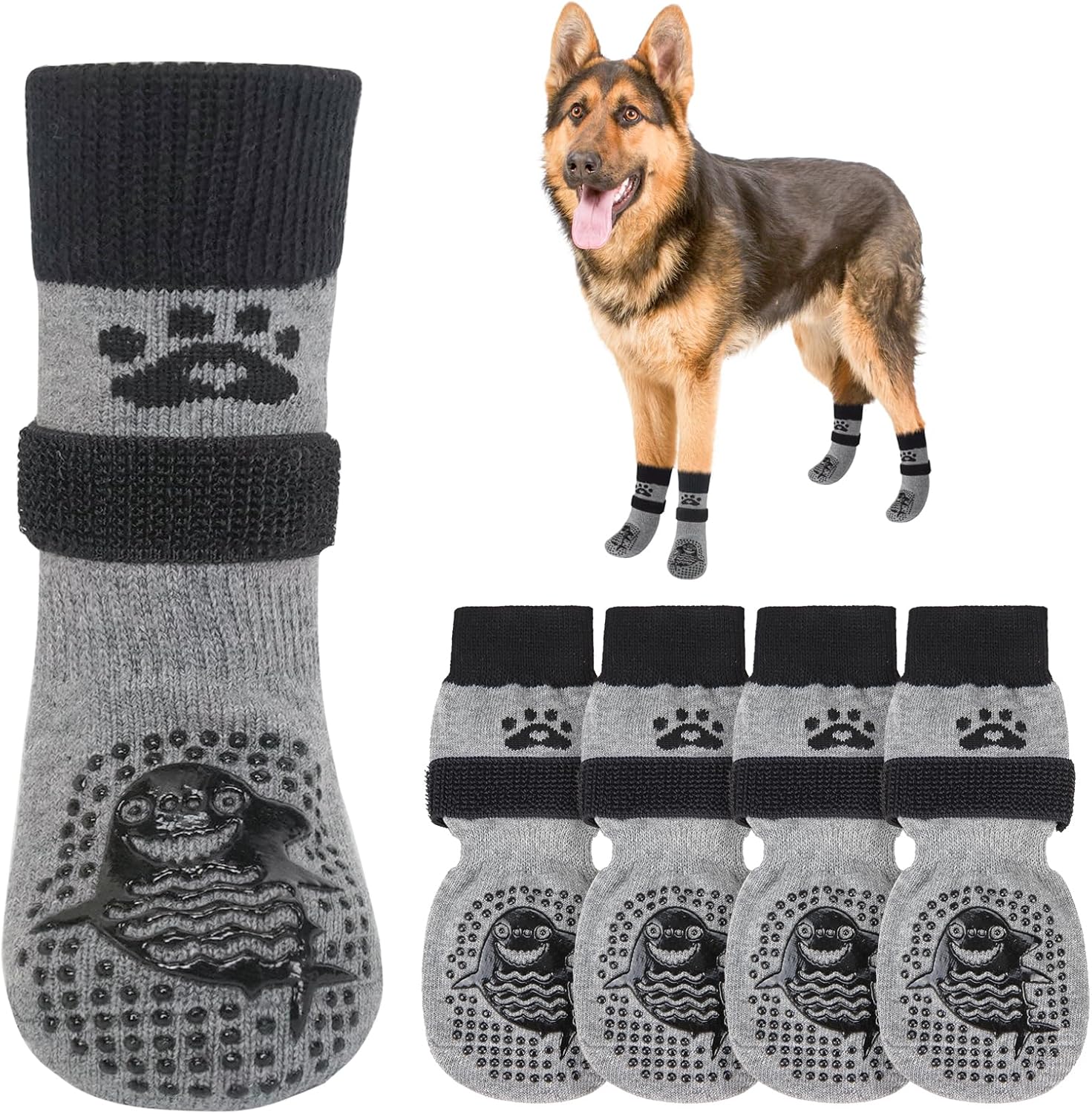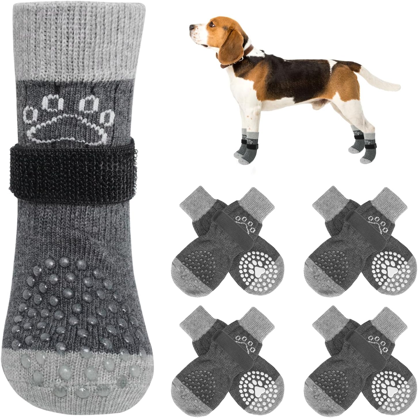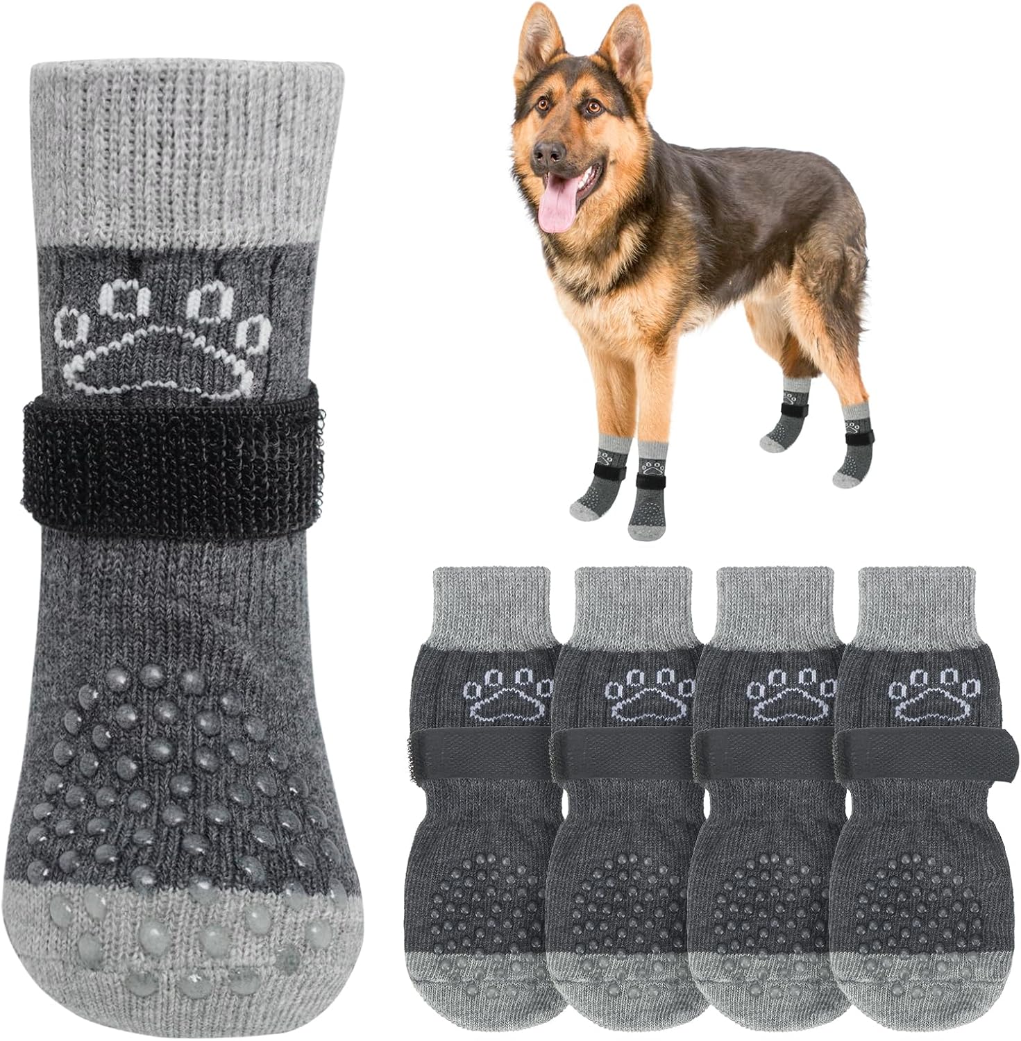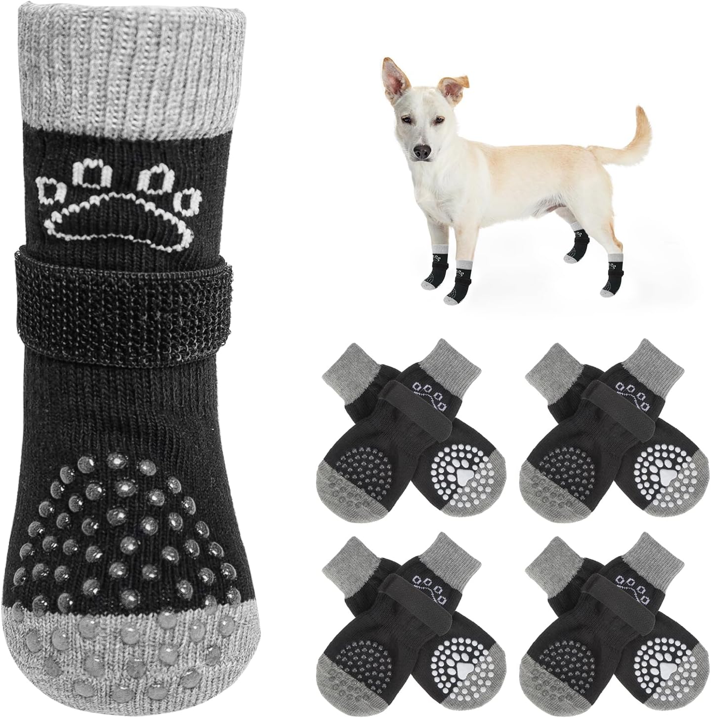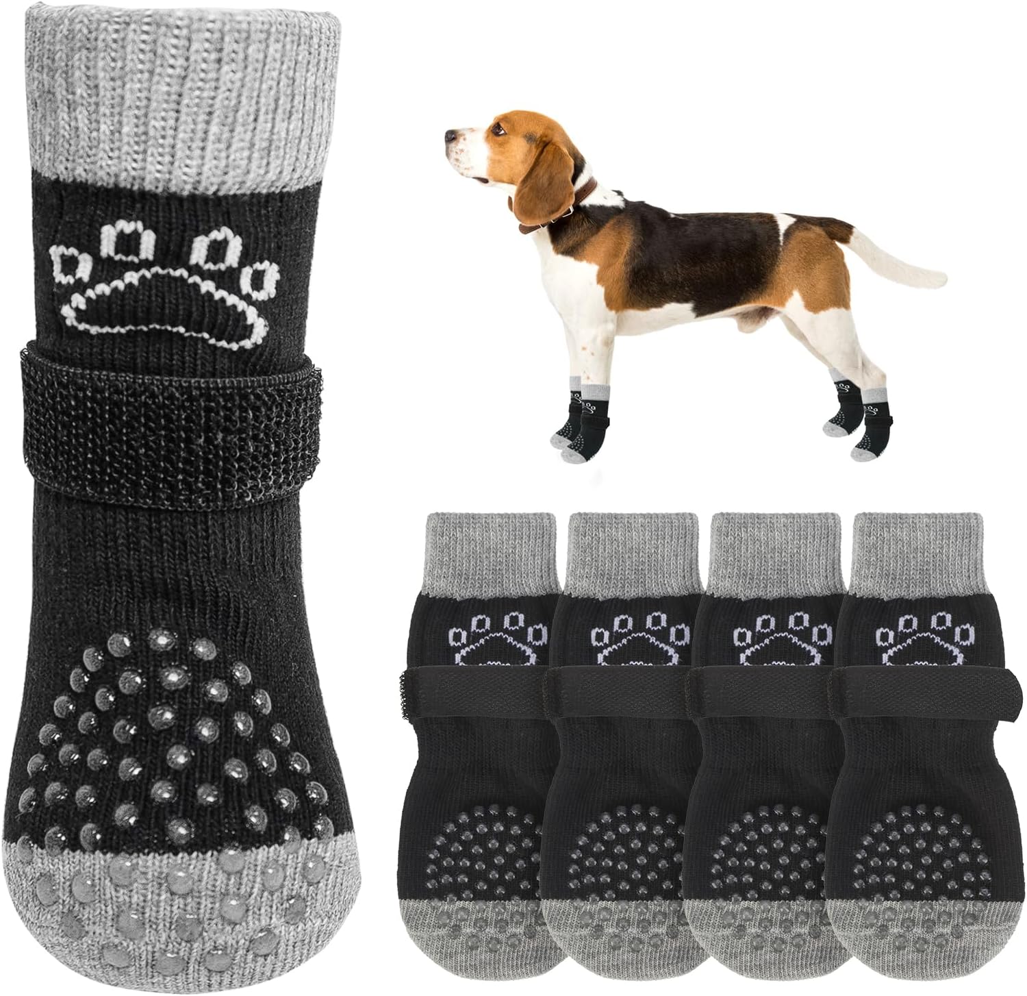 ANTI-FALLING COMFORTABLE ADJUSTABLE BELT: Extra adjustable, removable belt keeps the socks on your active puppy's paws and not easy to fall off. You can use the black elastic loops to adjust the tightness of your dog's socks to ensure that they won't fall off even during walks or runs. Note: Please leave a 1-2 finger gap to keep your furry baby comfortable.