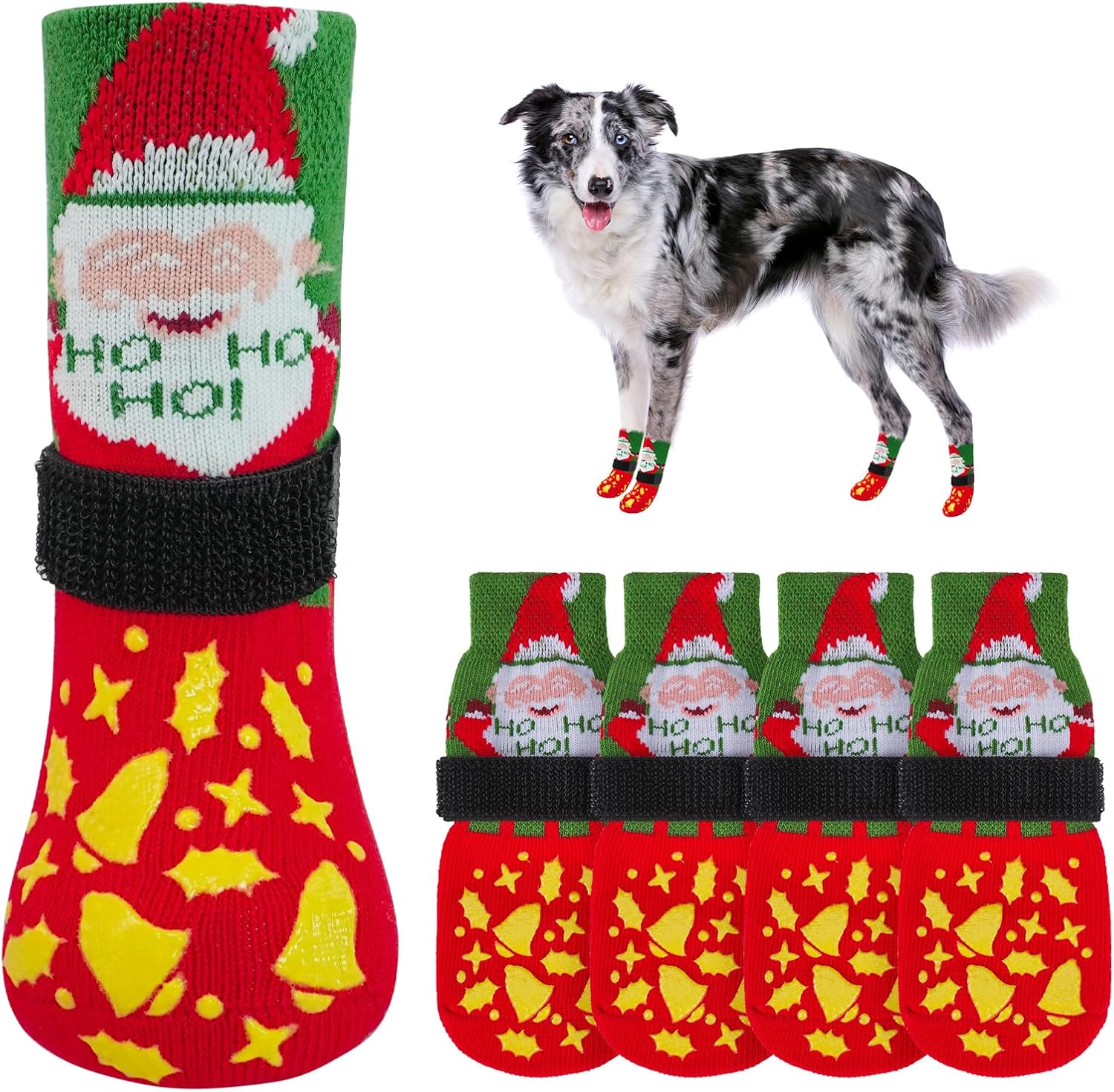DOUBLE-SIDED NON-SLIP DOG SOCKS WITH POWERFUL GRIP: The large double sided adhesive provides great extra grip to really help your senior dog walk around the house again! Double-sided grip makes the pet socks last longer. When one side of the grip wears out and has no anti-slip effect, you can let him wear the other side of the grip to get a new anti-slip effect, and the anti-slip pattern of the two sides is designed differently, so your dog can experience a different sense of fashion.