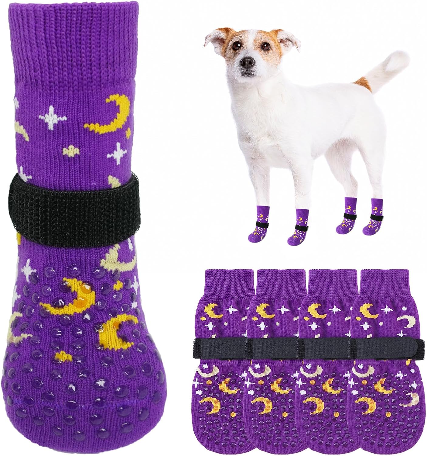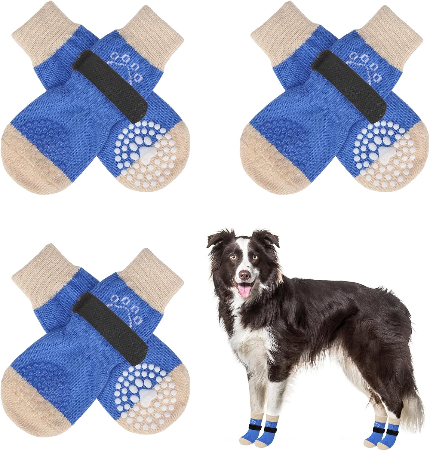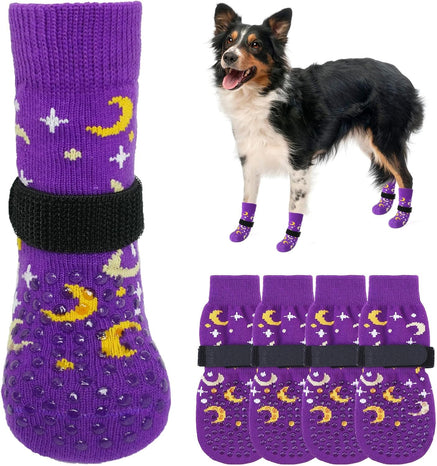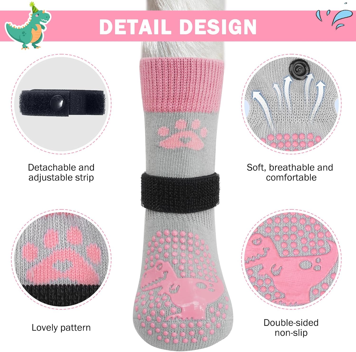 ANTI-DROP: The anti slip dog socks are elastic overall, but we added extra adjustable removable straps to hold the socks in place, so they never fall off easily. To ensure your dog's comfort, don't make them too tight.