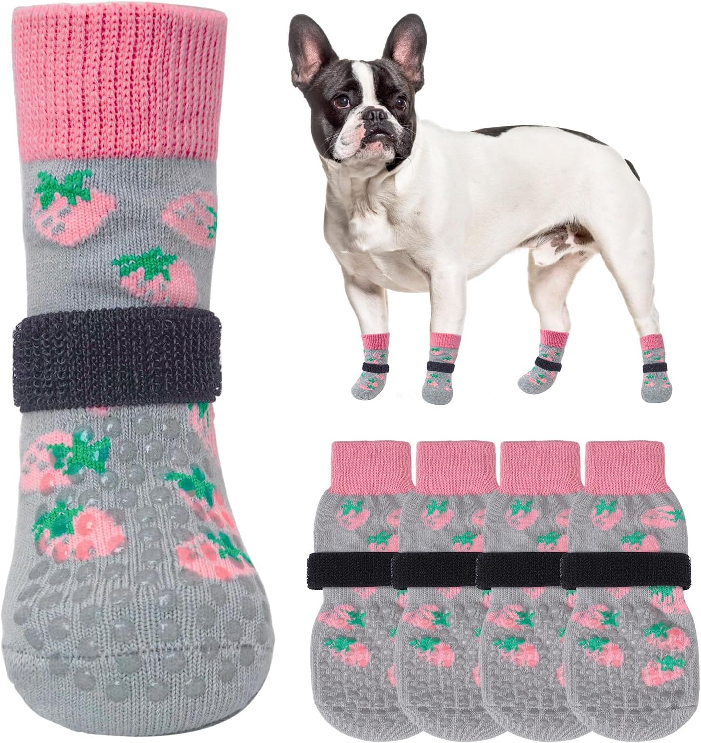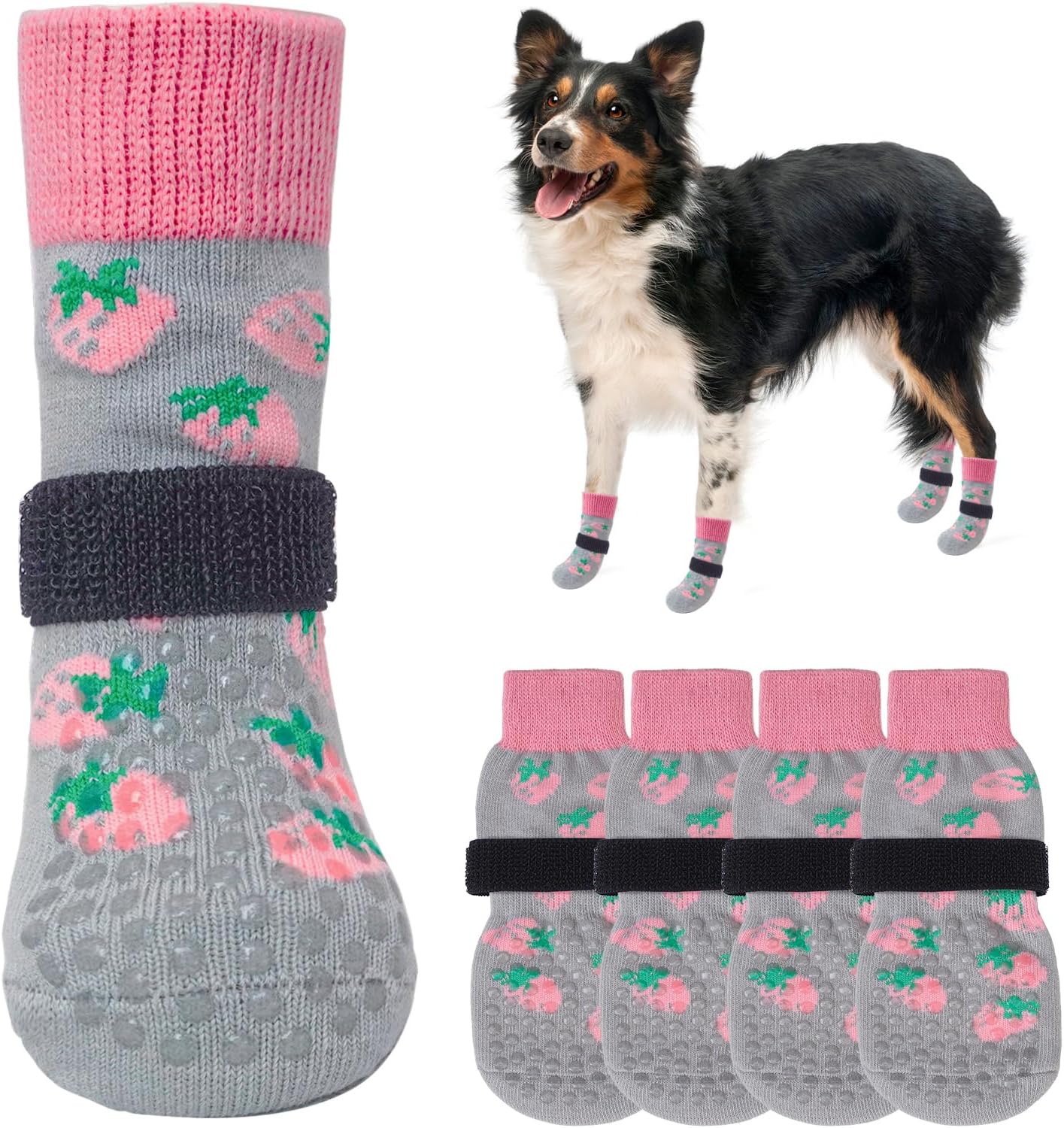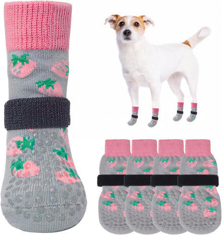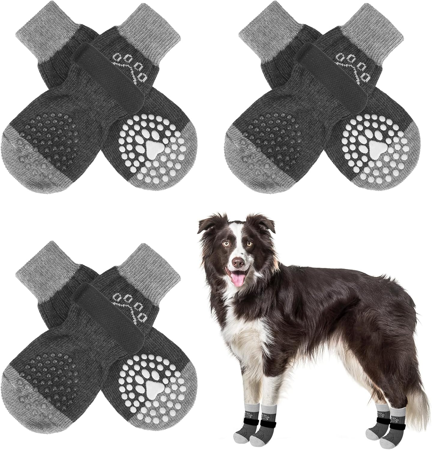 ANTI-DROP: The anti slip dog socks are elastic overall, but we added extra adjustable removable straps to hold the socks in place, so they never fall off easily. To ensure your dog's comfort, don't make them too tight.