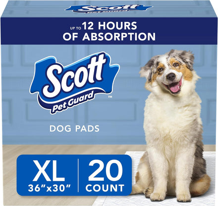 Scott Pet Guard Dog Pads are expertly designed for your dog. These pads are an indispensable tool for dog training, helping ensure that your furry friend learns where to go with ease and comfort. Whether you're a seasoned pet parent or new to the exciting journey of raising a playful pup, our training pads are tailored to meet the needs of your four-legged family member. Our leak protection pee pads are engineered with Scott's Leak Lock technology, ensuring each pad is up to 100% leak free. Place them anywhere around your home to help protect your floors. The pads are equipped with odour control technology, helping you maintain a fresh and clean household. The training scent of each pad is designed to help attract your dog to their doggie pad, aiding in the potty training process and helping minimize unwanted accidents elsewhere. Scott Pet Guard Dog Pads are constructed with multiple layers of protection. Beneath, the super absorbent core, locks in moisture for up to 12 hours, while the water-resistant plastic backing helps shield your floors from spills. These disposable training pads make clean-ups effortless—simply toss them after use. Ideal for young pups mastering potty training, our pads provide a convenient and reliable solution for pet training. At Scott Pet Guard, we create quality products for your best friend. Our absorbent pads are designed for dogs of all sizes, providing outstanding absorption for total protection.