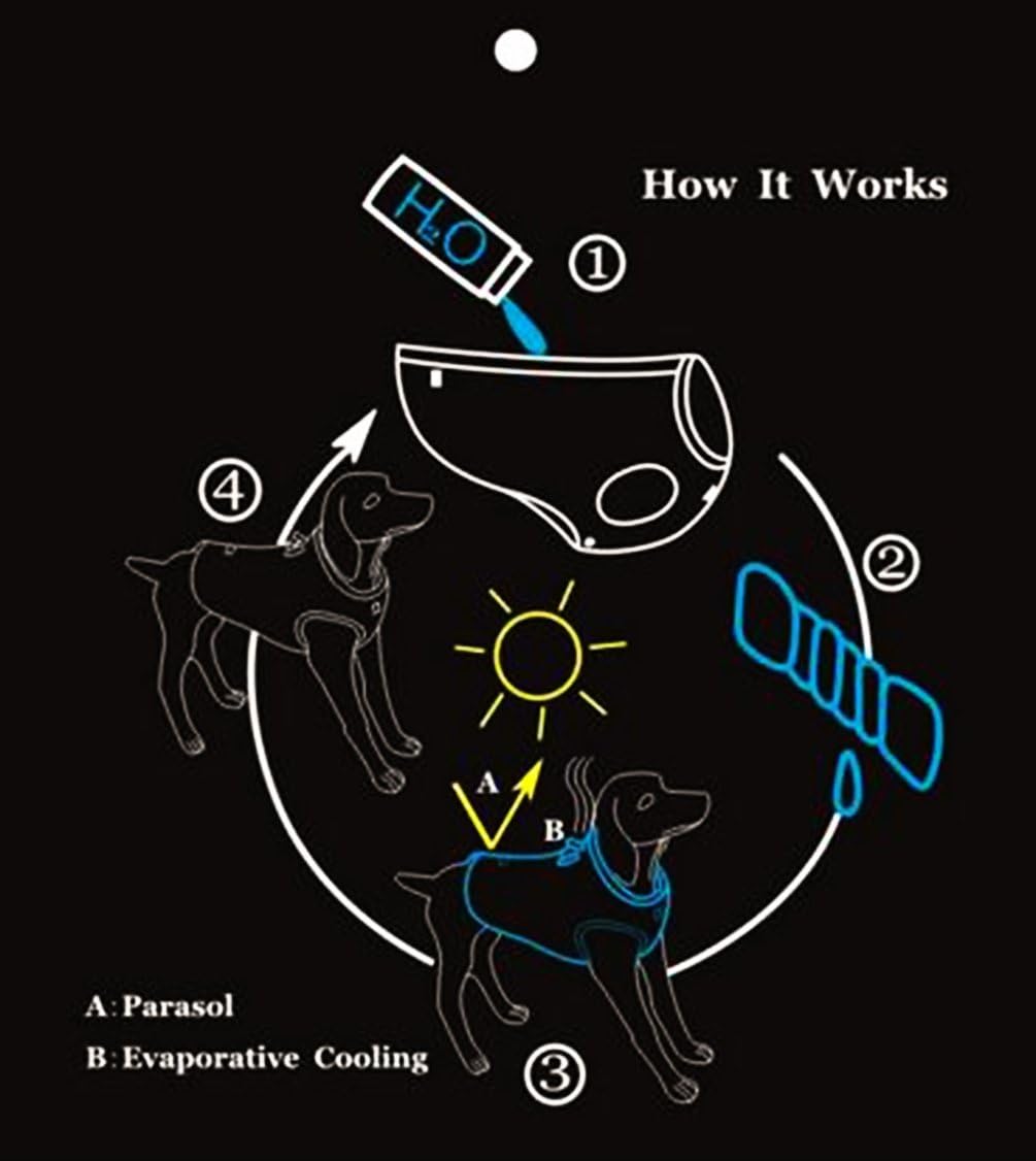 Dog cooler with 3 layer cooling fabric, Soak it in cold water, wring it out, and put the cooling vest on your dog, Evaporative cooling principle, During the phase transition from liquid water to water vapor, temperature drops, mesh material help wicking water, middle absorbent cotton holding water isolate from dog’s skin, mesh scatter the ice feel to 4-way of dog’s body.