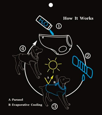 - SIZE SUGGESTION:Please measure your dog's chest and neck following the size chart before ordering. TECHNOLOGY: dog cooler with 3 layer cooling fabric, Soak it in cold water, wring it out, and put the cooling vest on your dog, Evaporative cooling principle, During the phase transition from liquid water to water vapor, temperature drops, mesh material help wicking water, middle absorbent cotton holding water isolate from dog’s skin, mesh scatter the ice feel to 4-way of dog’s body