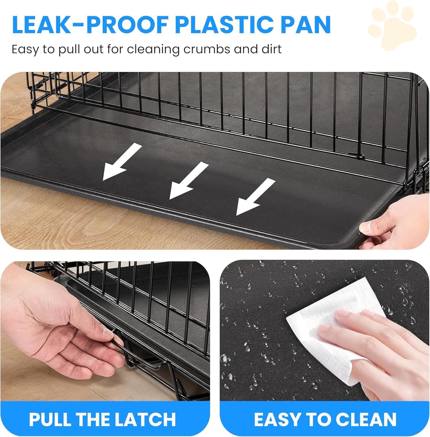 - Easy to Clean: The bottom of the dog crate with movable mop tub, which is easy to pull out, you can quickly clean. The dog cage includes a durable leak-proof ABS composite tray that won't stain, deform or retain your pet's odor