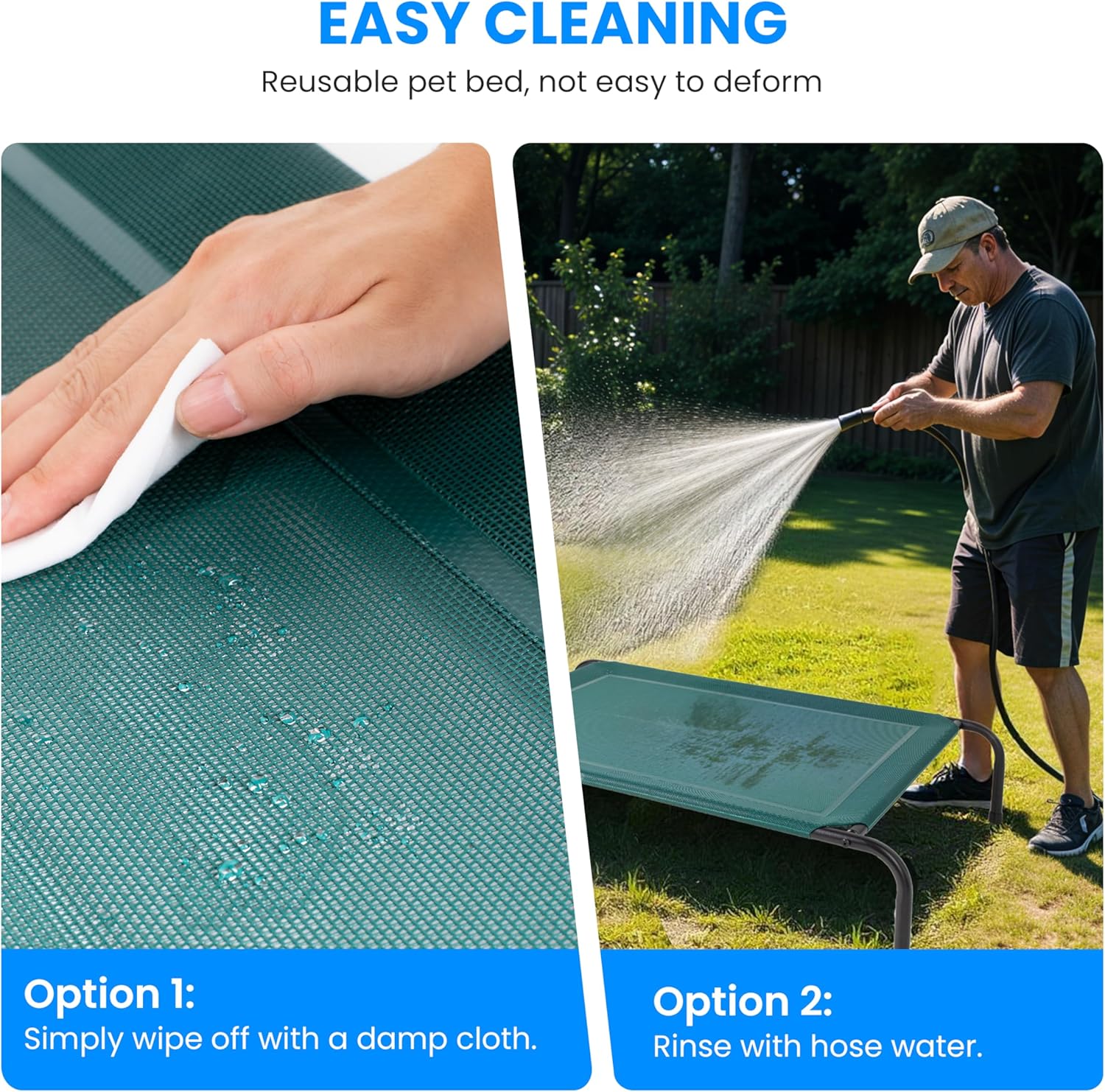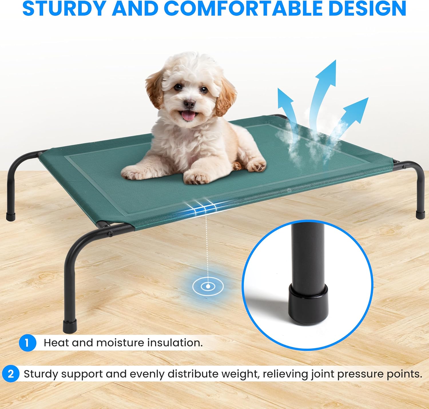 - Cooling Comfort: This dog bed's breathable fabric and elevated design allows air to flow right through the fabric, keeping your dog cool all year long. Sleeping with an elevated dog bed is more comfortable, dryer, cleaner and healthier compared to the ground