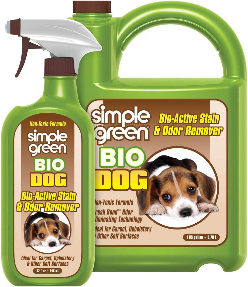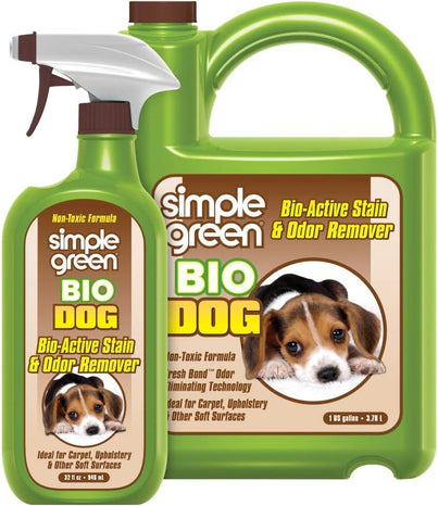 Simple Green Bio Dog Active Stain & Odor Remover - Enzyme Cleaner & Stain Remover for Carpet, Rugs & Fabric – eliminates Urine Odor (32 oz Spray & 1 gal Refill)