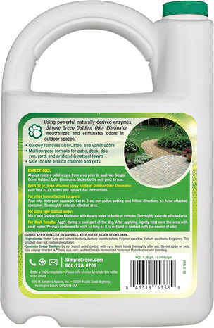 Simple Green Outdoor Odor Eliminator neutralizes and eliminates odors in your outdoor spaces using powerful, naturally derived microorganisms. The non-toxic formula is safer for use around pets and will not harm landscaping when used as directed.