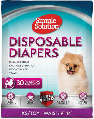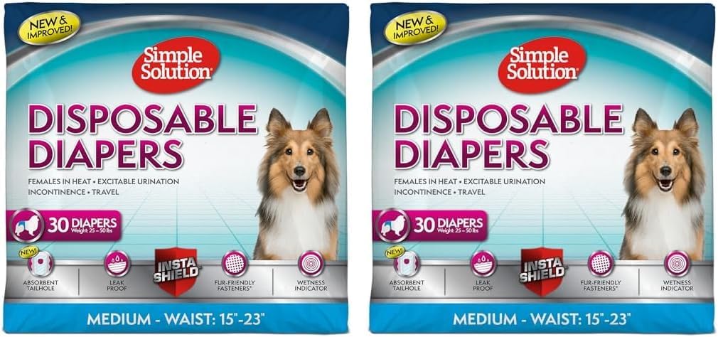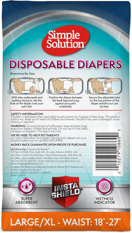 Redesigned with a way better fit than our previous diapers, Simple Solution Disposable Dog Diapers protect your home and give you peace of mind. Fur-Friendly Fasteners, leak proof barriers, and a super absorbent core mean comfort for your pet and no pee on the floor. The wetness indicator will let you know when it’s time to change the diaper. And they come in new adjustable sizes that aren’t just a close fit, they’re a perfect fit.