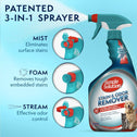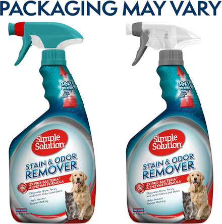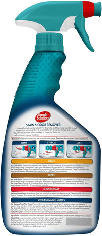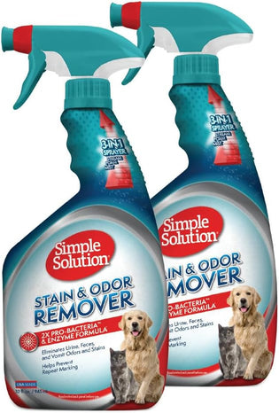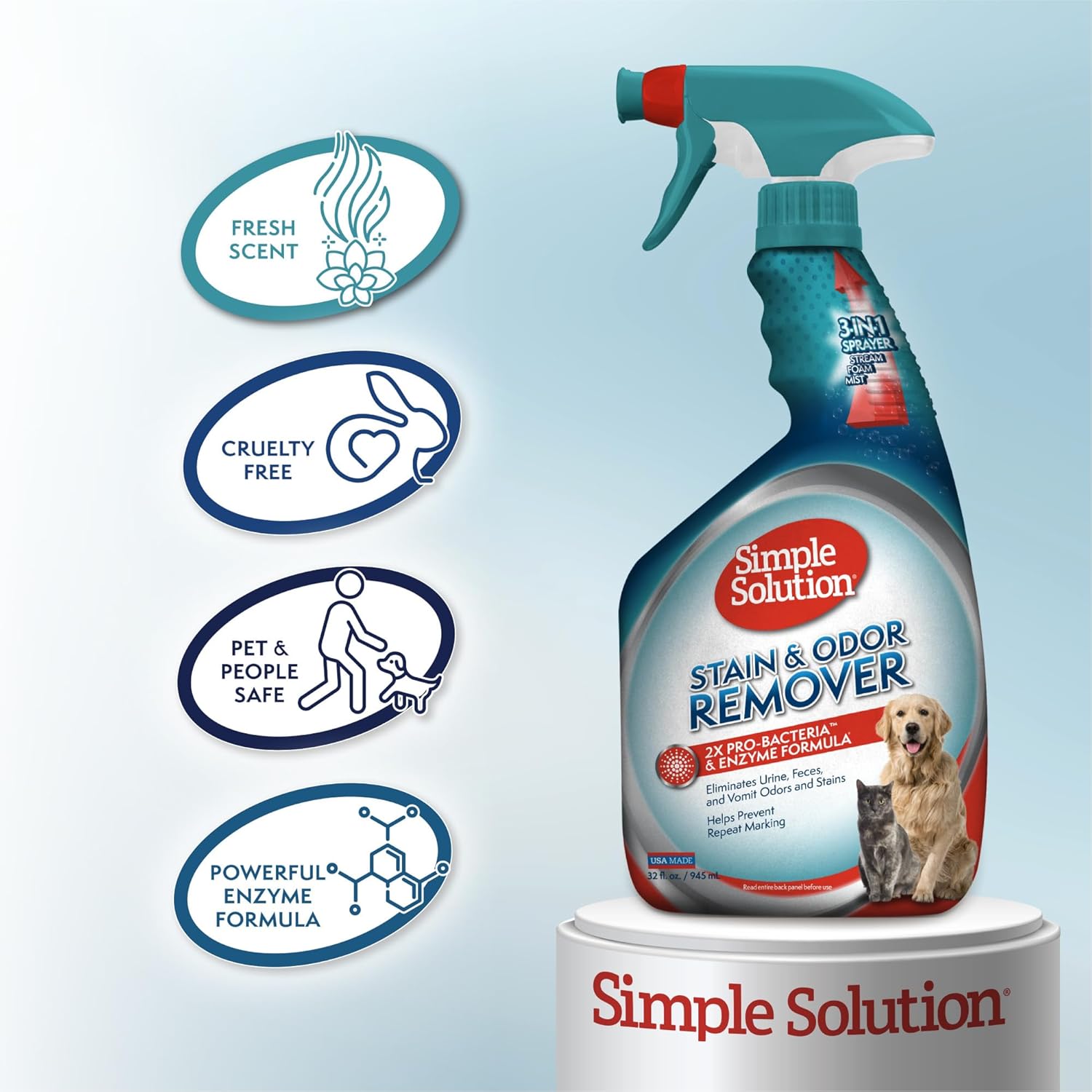 Eliminate tough pet messes with Simple Solution Stain and Odor Eliminator Spray for Dogs & Cats, a powerful enzymatic spray designed to permanently remove stains and odors caused by urine, feces, vomit, and more. This 32 oz floor cleaner features 2X Pro-Bacteria Cleaning Power, breaking down even the most stubborn messes at the source. Perfect for pet parents, it works as a dog odor & stain remover, pee remover carpet cleaner, cat pee odor remover carpet, and dog smell remover, ensuring your home stays fresh and clean. Safe for use on carpets, upholstery, bedding, fabric toys, clothing, mattresses, and any water-safe surface, this pet enzyme cleaner cat solution is also an excellent carpet pet stain remover, enzyme cleaner upholstery, and car carpet odor remover. The patented 3-in-1 nozzle sprayer lets you choose between foam, mist, or stream for targeted cleaning. Whether you need a cat pee enzyme cleaner mattress, pet stain eliminator, or dog enzymatic cleaner, this enzyme spray odor eliminator is your go-to choice. Ideal for tackling puppy accidents, pet stain removal, and cat pee smell remover, it’s the best dog pee cleaner for keeping your home fresh. Trust Simple Solution—your expert in pet stain neutralizer, dog floor cleaner, and anti-pee spray for dogs inside!