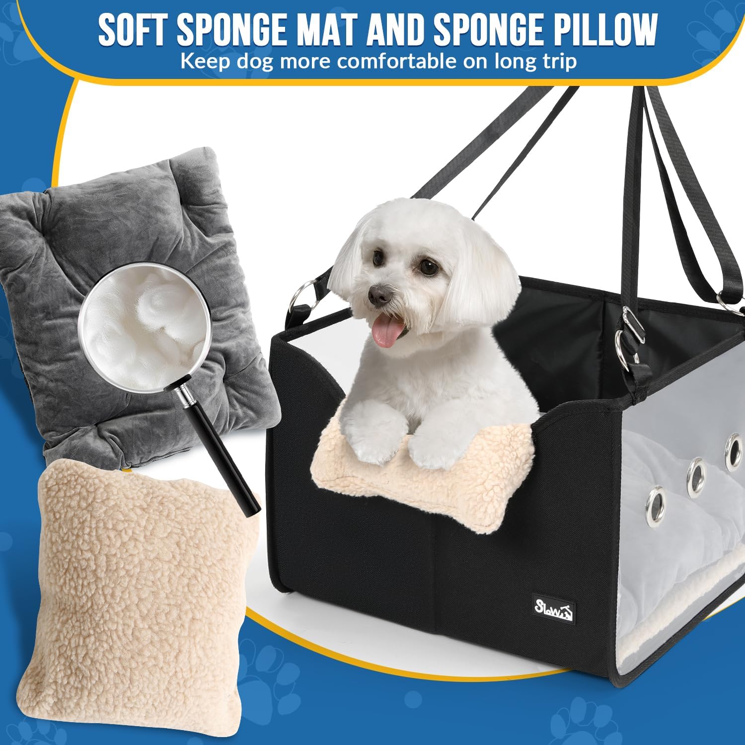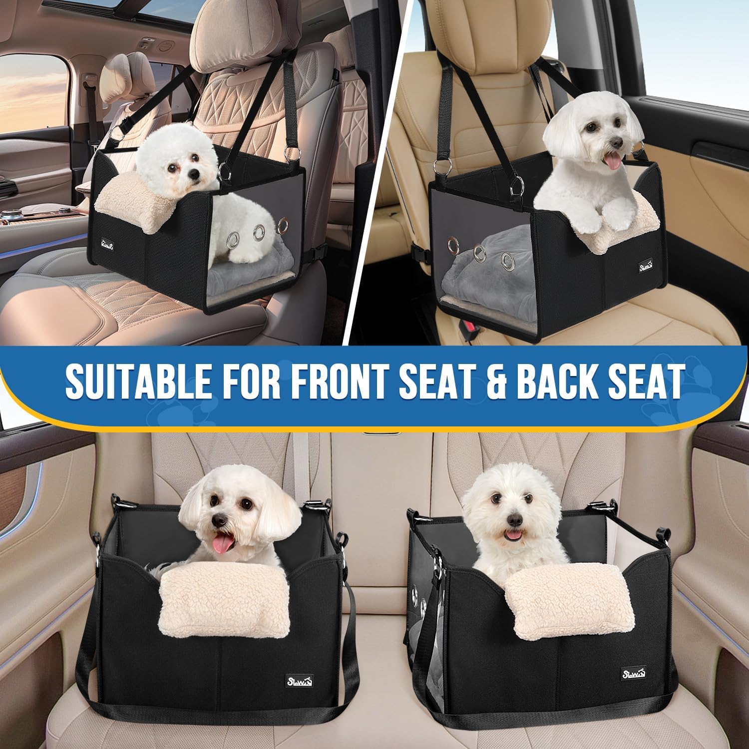 - Keep Your Pets Safe --- Our dog car booster seats for puppies have 2 straps for the headrest and one strap for the back of the seat to keep the seat stable. At the same time, there is an adjustable safety rope inside the seat, which can be clipped from the inside of the booster seat to their collar. This ensures that your beloved puppies stay put during your trips, giving you peace of mind while keeping your dogs safe.