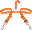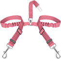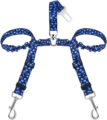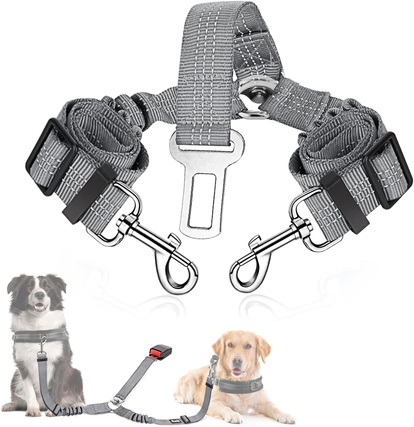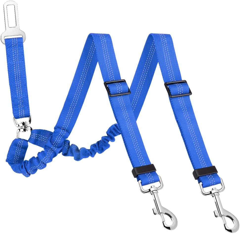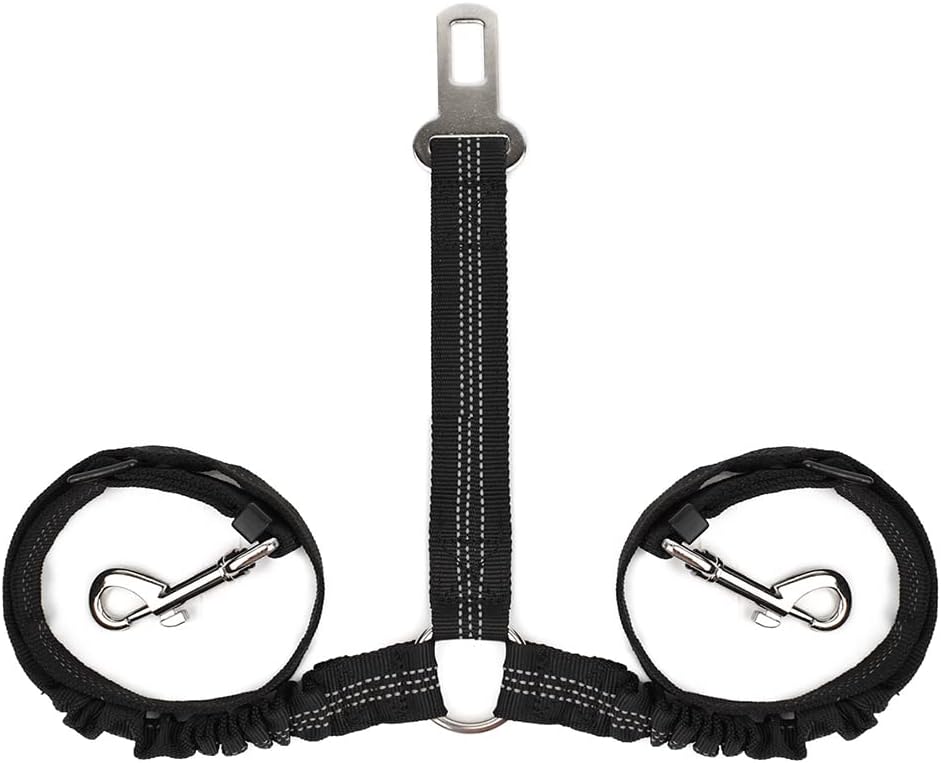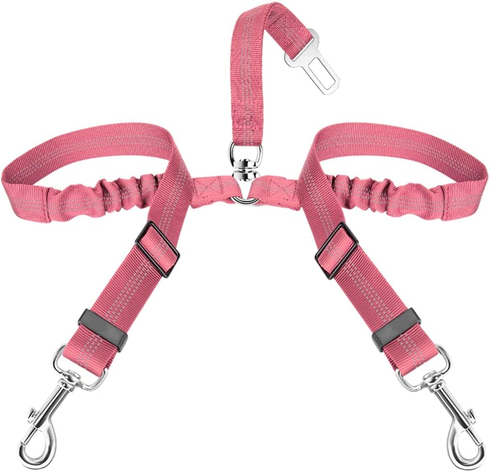 - Well-made and Special Design--- Designed with the inverted Y piece, and two elastic nylon bungee straps being linked to a seat belt clip with a ring, this 2 in 1 No-Tangle dual dog seatbelt harness helps keep two dogs separated, not twisted into each other. Also, the reflective stitching design makes it ideal for night use. The elastic bungee helps prevent the dog from jerking while sudden movements.