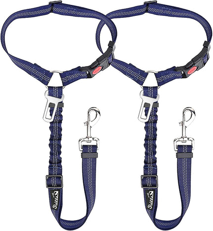 - Adjustable Seatbelts --- With a buckle and the elastic bungee inside, the seat belt can be adjusted from 20 inches to 27 inches and stretched to a maximum length of 32 inches. The circle can be adjusted from 16 inches to 24 inches. An adjustable car seat belt harness allows the dog to get comfortable without limiting himself.