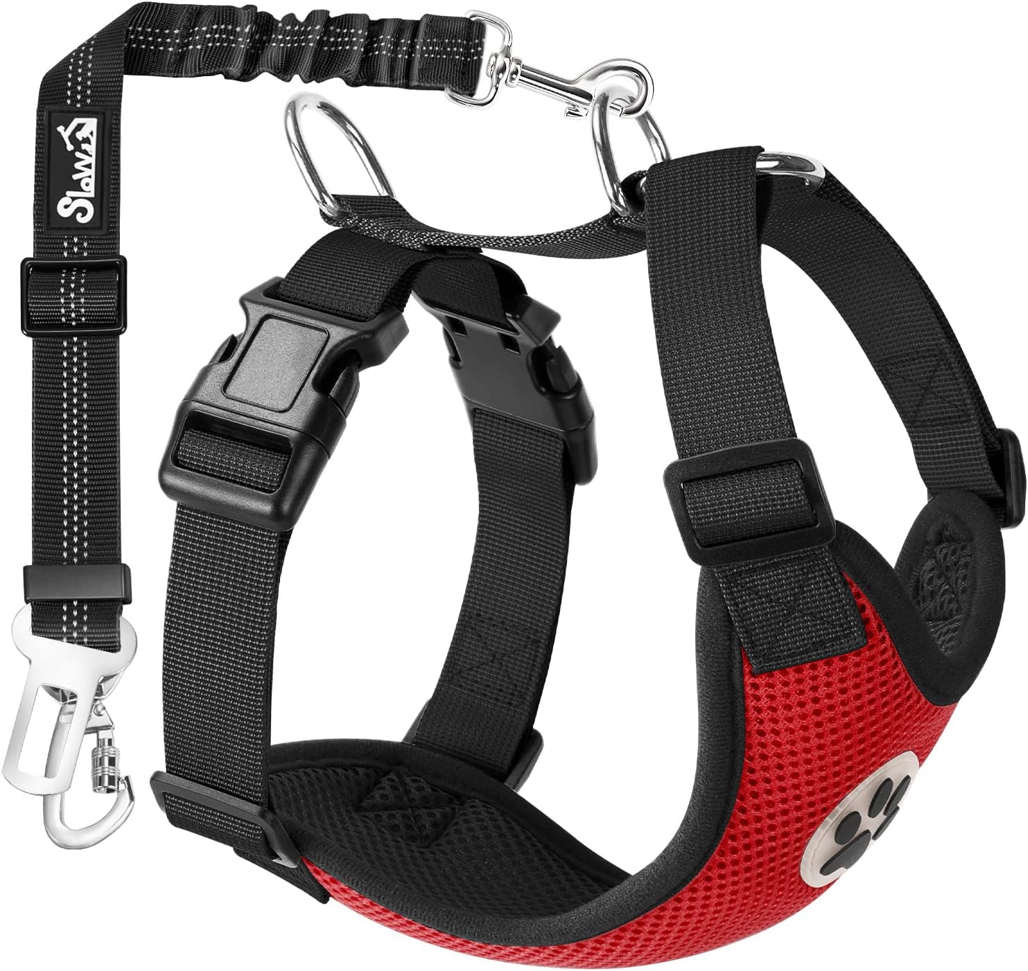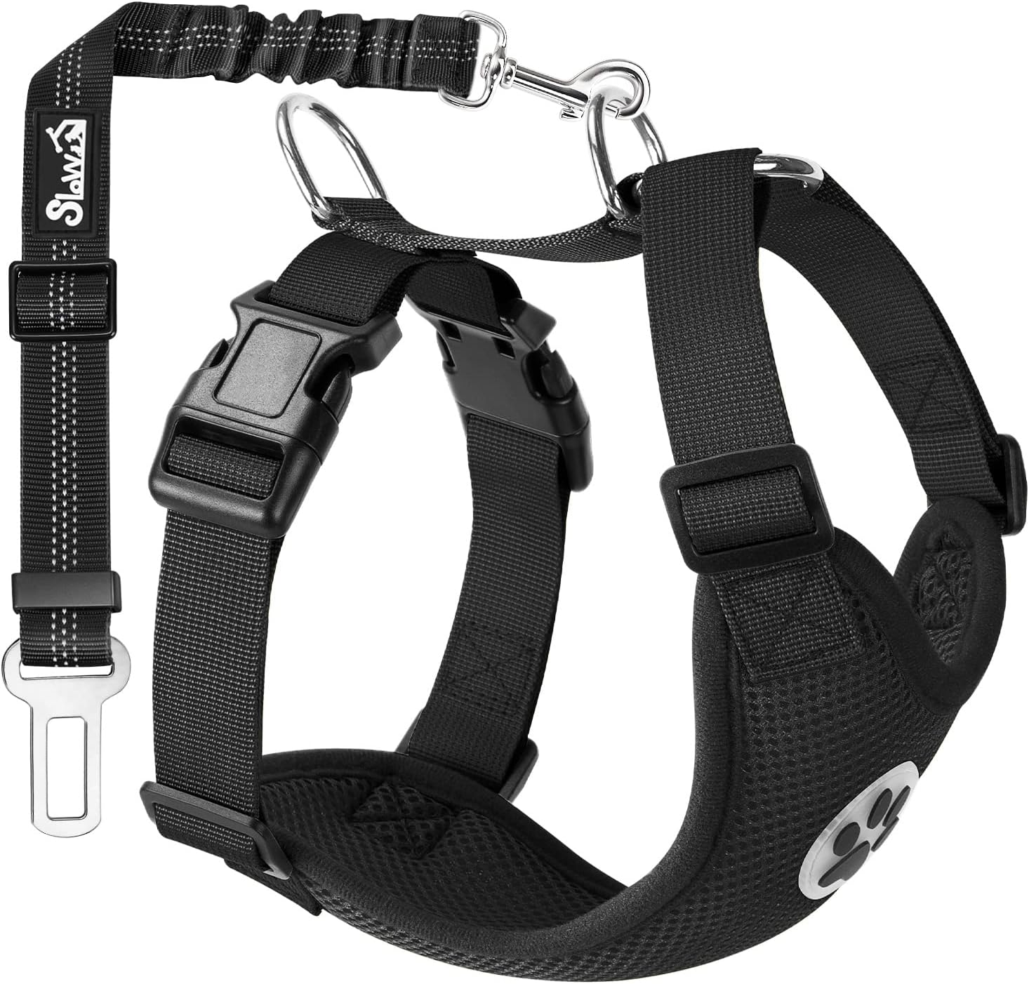 - Upgraded 2 In 1 Seatbelt --- SlowTon dog harness has upgraded the connect seat belt to ensure universal fit for most of vehicles, by adding a lockable tangle-free carabiner. It can be hooked to latch bar or headrest rod when traditional safety belt is not compatible with car buckle socket.