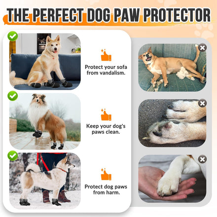 - All-Season Paw Protection --- Made from high-quality neoprene, these dog shoes are breathable, soft, and durable, offering year-round protection from winter snow, salt, summer hot pavement, gravel, glass, and thorns, while also protecting indoor surfaces like sofas and carpets.