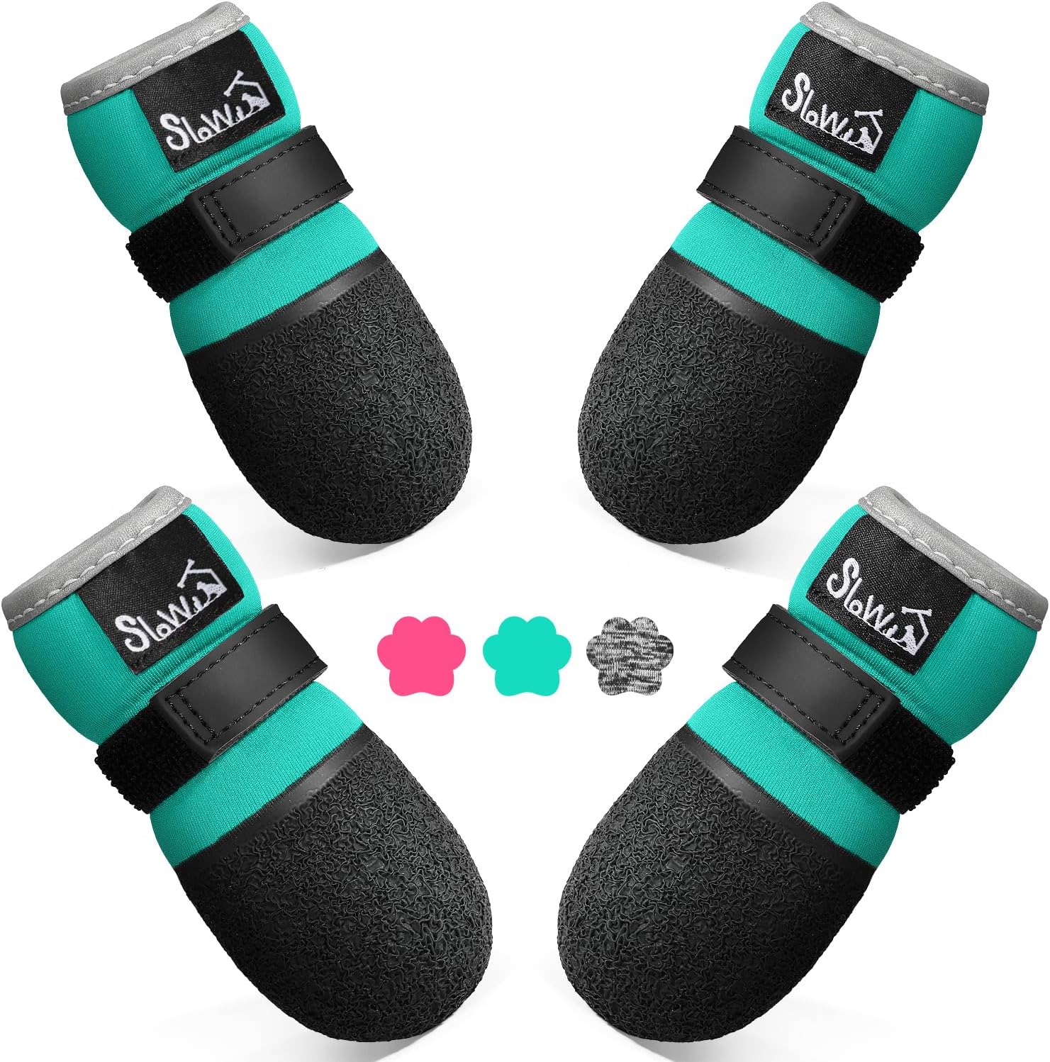 SlowTon dog shoes, made of waterproof and breathable neoprene and soft rubber, with reflective stripe designs, provide your dog with a comfortable and safe wearing experience, letting your puppies run or walking freely Protects Paws: Made of quality neoprene, our dog shoes are breathable, soft and durable, protecting your dog’s paws from road debris, shingles, and cold or hot surfaces Easy to Put On and Take Off: Designed with hook and loop strap at the opening, these dog shoes make it easy for you to put on and take off for your dog, and adjustable to better accommodate for different sizes of feet Non-slip and Waterproof Rubber Sole: Our dog booties feature a pleated rubber sole, which is soft, waterproof and non-slip. These dog boots avoid their paws getting wet on rainy or snowy days, and allow puppies move and stabilize on indoor floors and outdoor surfaces Reflective Stripes Design: There is a reflective stripe design on the openings of non-slip dog booties, which improves the visibility at night, promoting the safety of walking in low light environment or at night Specification: Product Name: Dog Shoes Material: Neoprene + Rubber Color(Available): Rosy Red, Green, Black + White Included Items: 4 × Dog Shoes