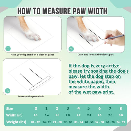 【Size Option】Optimal Fit with 8 Size Options. Our size is based on the inner diameter of the boots for dogs, please be sure to measure the width of your dog's paws carefully cause it is the key to choose the correct size for your dog. You can refer to the size chart to select the appropriate size for your dog to obtain the most comfortable fit.