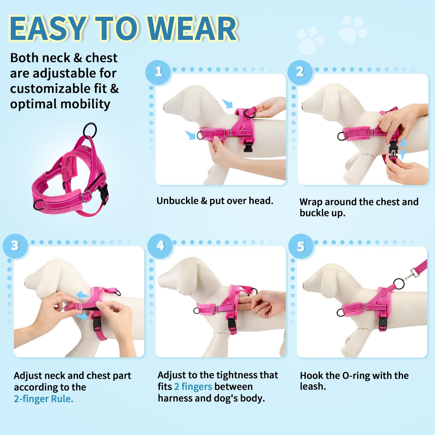 - Easy On & Lightweight --- Instead of step-in way, this halter harness is easy stress free put on through dog’s head. The only 1 snap buckle on the tummy part make the applying and removing in seconds. Very light weight material adopted, even the back metal D ring, make small dogs feel ease when walking.