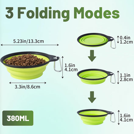- VERSATILE USE: 5.2(L)*3.3(Bottom)*1.6(H) inch(expanded), 0.4 inch height(folded), each bowl holds up to 13oz/380ml of water, come with 2 bowls,Perfect for both food and water, suitable for small to medium dogs/cats during walks, camping trips, or outdoor activities.