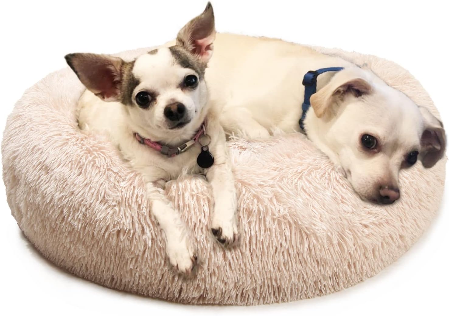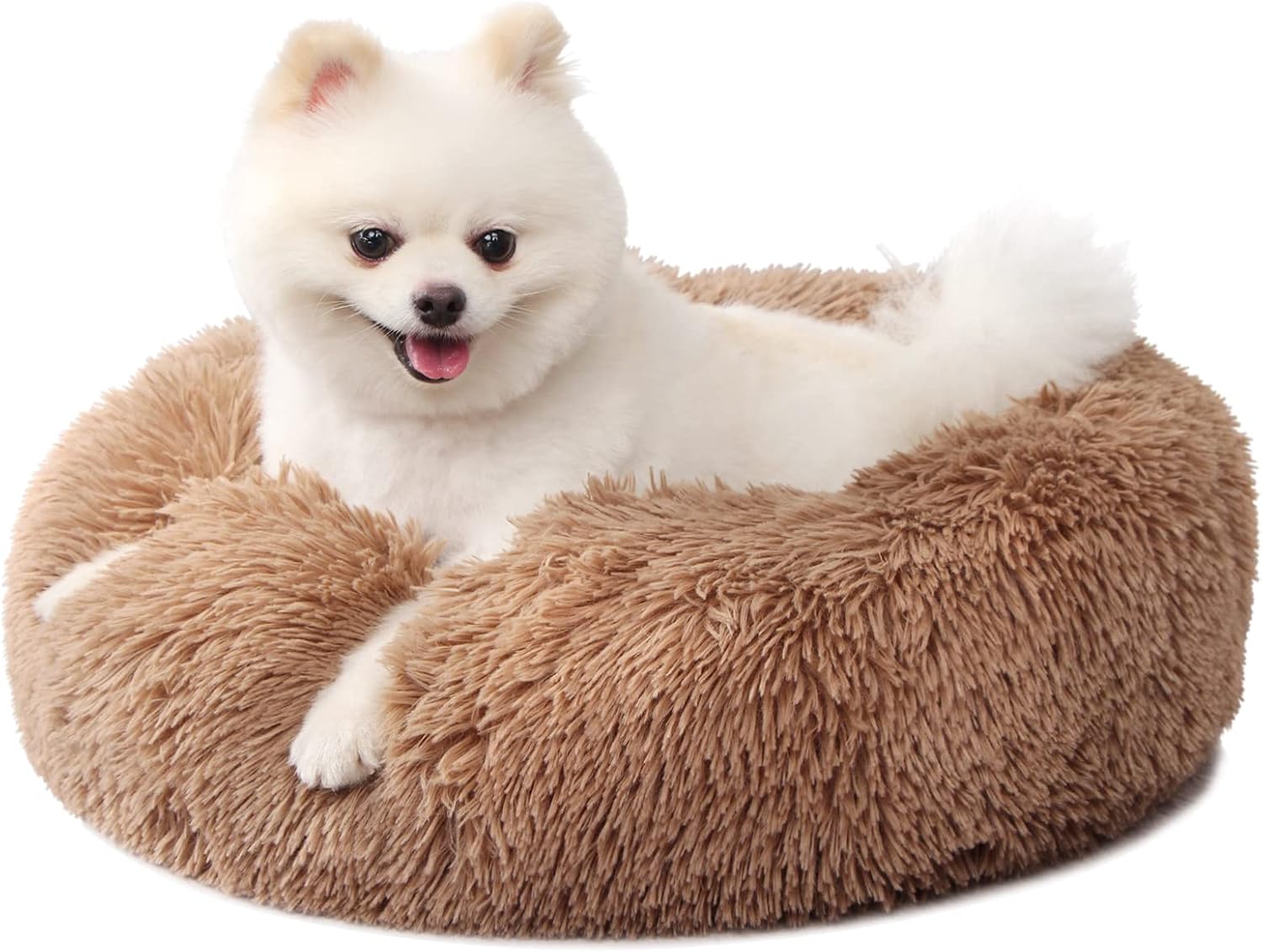 - The dog calming bed is about 19.7”x 19.7”x 6'', perfect for cat or small dog up to 10 lbs to curl up or sprawl on the fuzzy dog bed, this orthopedic dog beds is finished with faux shag fur, ultra soft, warm and comfortable, Satisfies the nesting instinct of dogs who tend to curl up when they sleep
