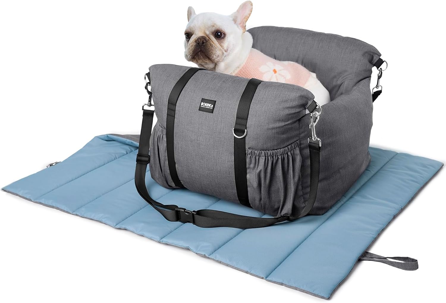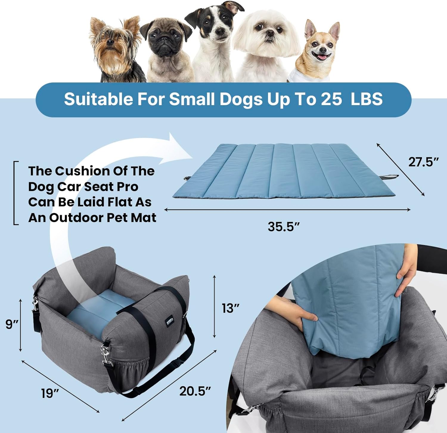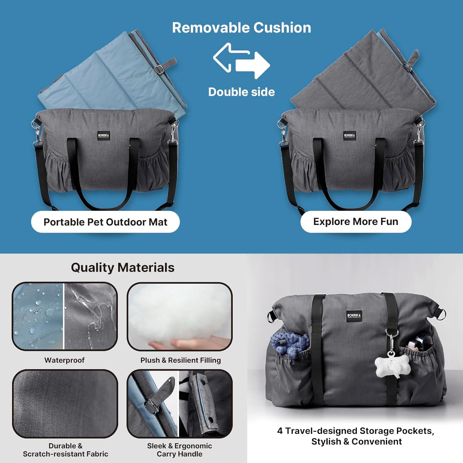 - Comfortable Material & Specialized Outdoor Mat: The dog car seat surface is made of a blend of 20% cotton and 81% polyester, offering a soft touch, while the high-density sponge reduces road vibrations. Equipped with a specialized outdoor mat designed for dogs, which is foldable for easy transportation, providing a comfortable resting place for your pet whether you're on outdoor adventures or short trips.