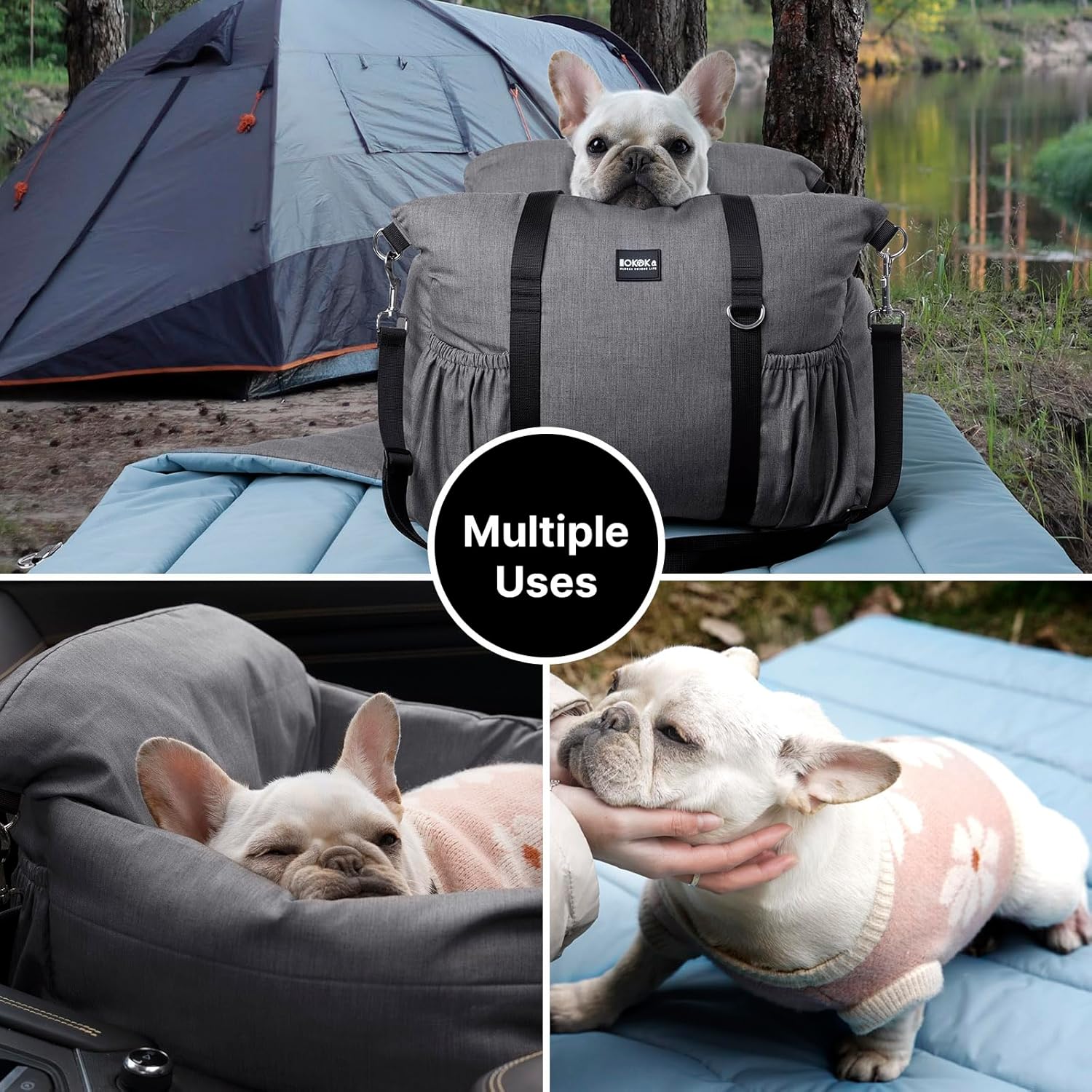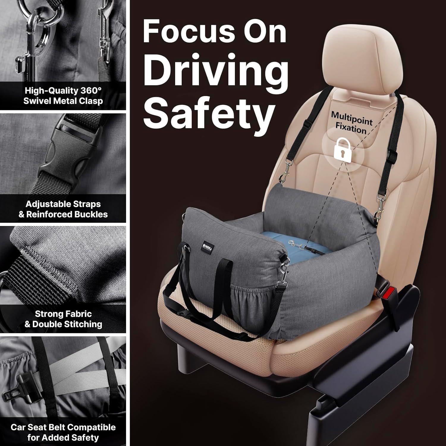 - Safety and Reliability: The dog car seat is securely fastened with seat belts and headrest straps, along with adjustable buckles and safety ropes, ensuring your pet's safety. The adjustable leash, hidden beneath the booster cushion, prevents pets from jumping out.