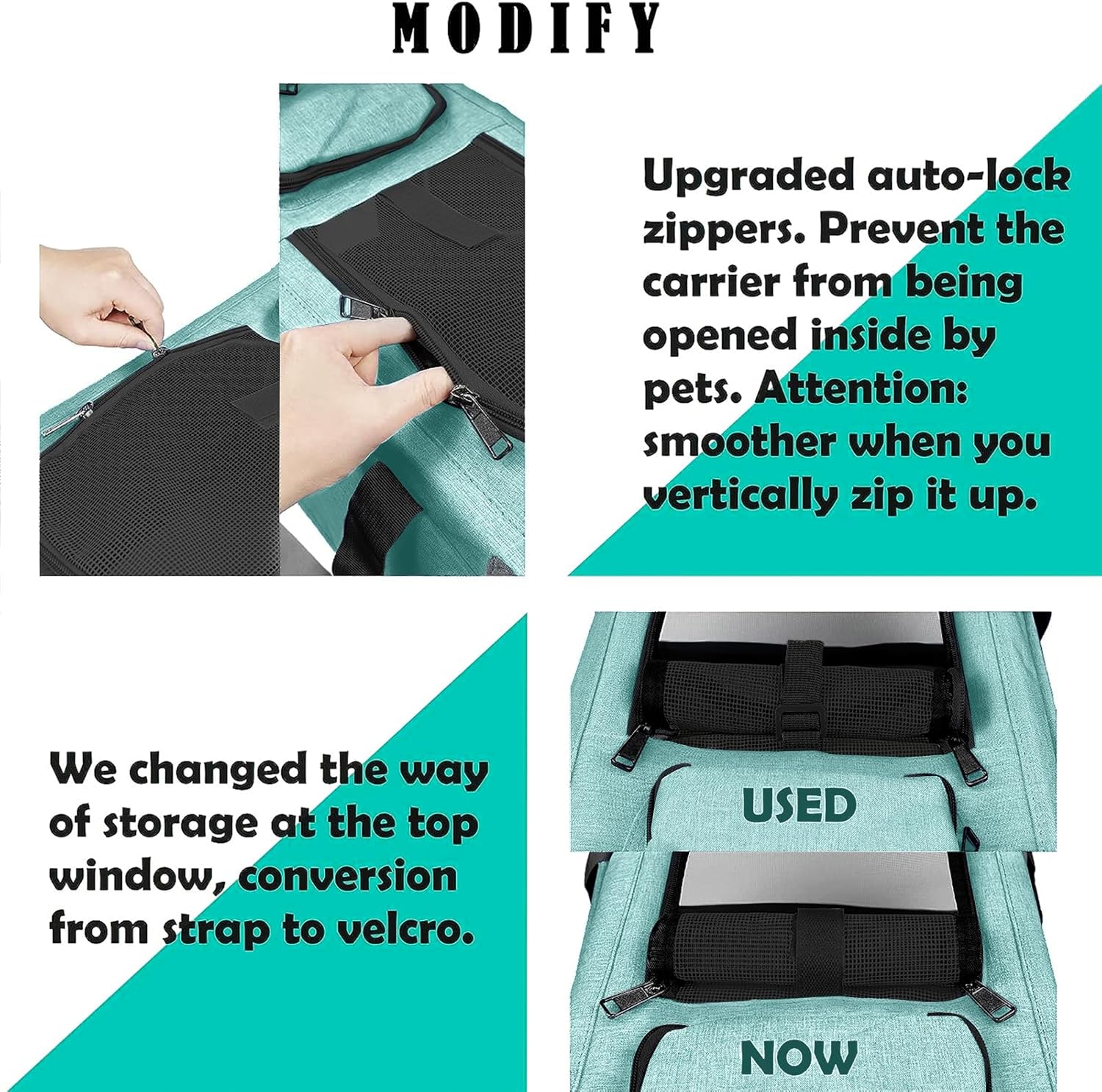 To prevent the carrier from being opened inside by pets, we change the zippers into auto lock zippers. If you feel zippers get stuck, try to make level the edges first and vertically zip it up. And top of the window conversion from strap to velcro now.
