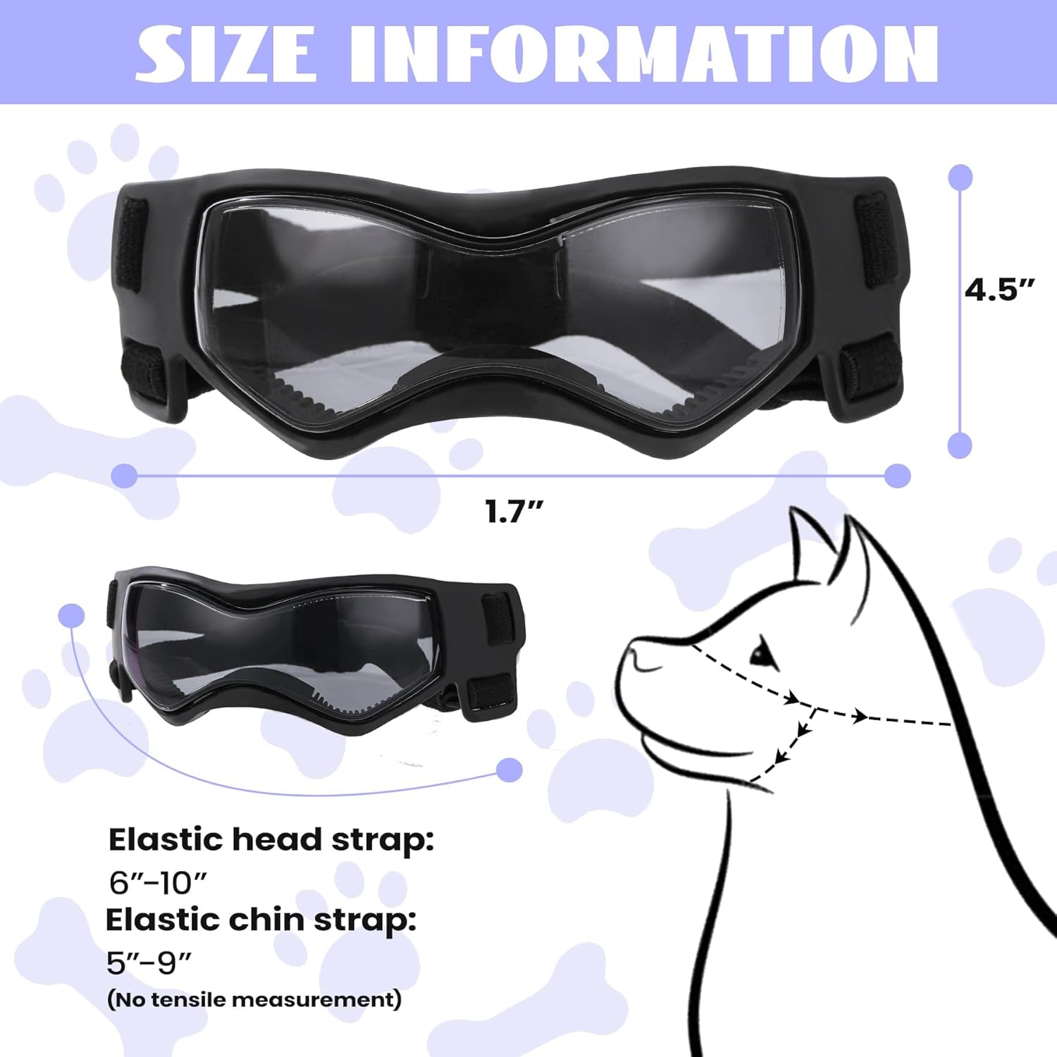 - Size of Small Dog Goggles: Length 4.5”, width 1.7”. Length of head strap: 6”-10”, length of chin strap: 5”-9”. Please measure your dog before purchasing.