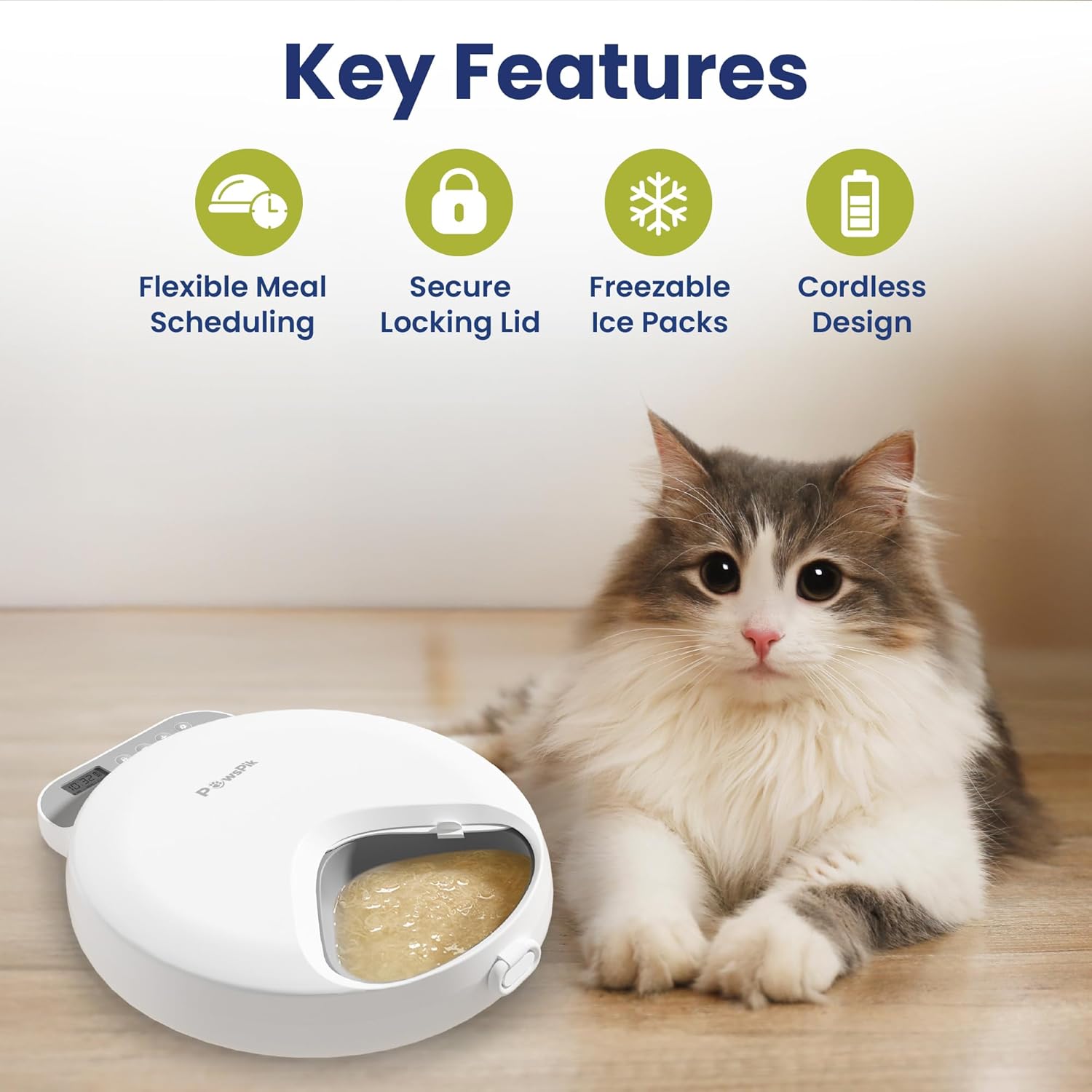 The PawsPik automatic pet feeder ice packs keep food fresh up to 24H. First 8H at 0°C for fresh-keeping, then 9–24H at low temp to preserve wet or dry food safely.
