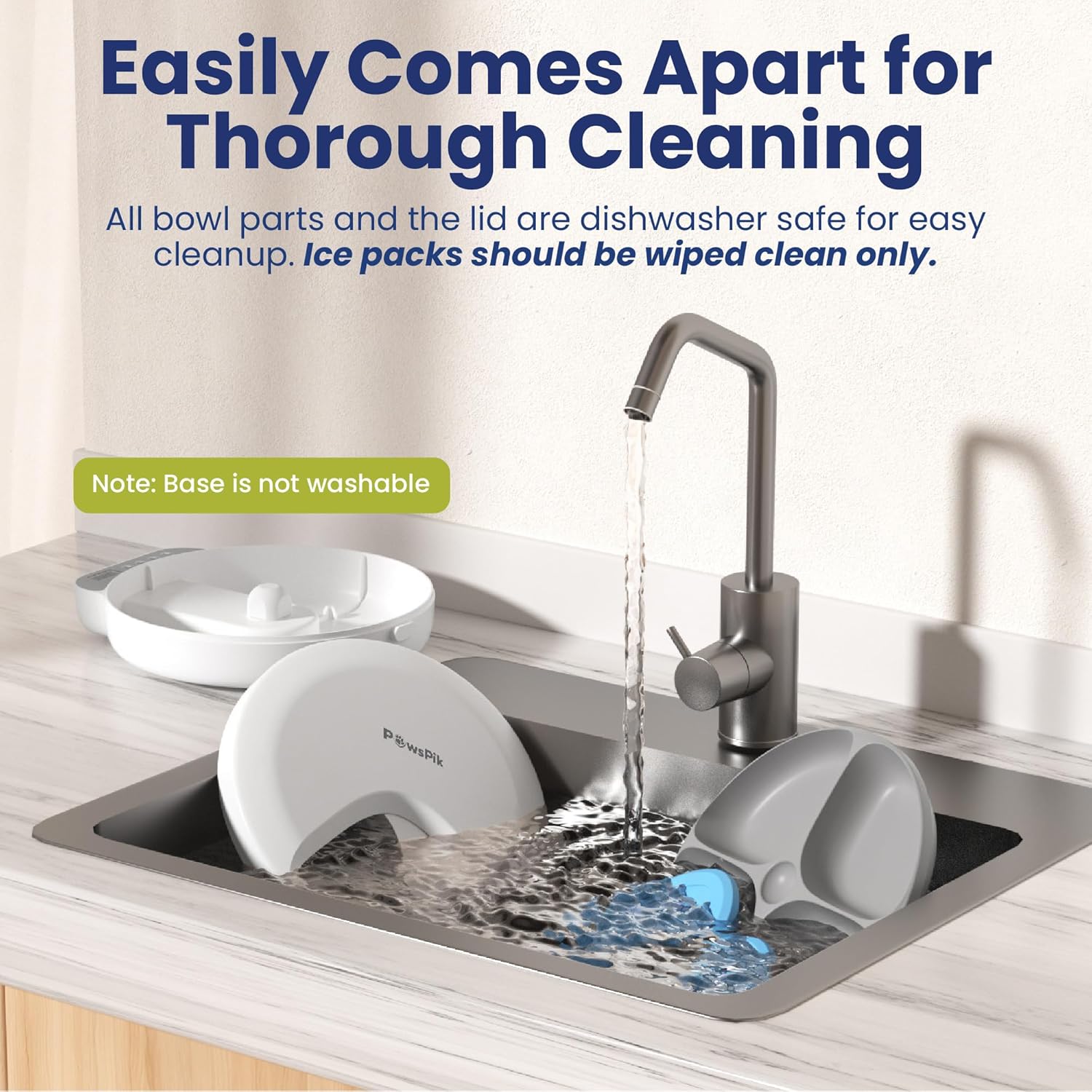 All bowls and lid are dishwasher safe for easy cleaning. The base is not washable. Ice packs should be wiped clean onl