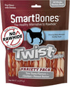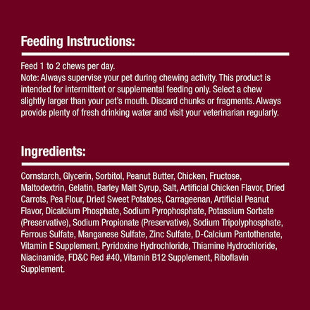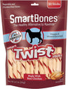 SmartBones Smart Twist Sticks With Peanut Butter are made with real chicken and vegetables and real peanut butter for a scrumptious taste your dog can’t resist! These rawhide-free chews are an easy-to-digest alternative to traditional rawhide. Plus, they are vitamin- and mineral-enriched for a treat you both can feel good about. Chewing helps maintain healthy teeth, so these chews are both engaging and beneficial. Feed 1 to 2 chews per day. Note: Always supervise your pet during chewing activity. This product is intended for intermittent or supplemental feeding only. Select a chew slightly larger than your pet’s mouth. Discard leftover chunks or fragments. Always provide fresh drinking water and visit your veterinarian regularly.