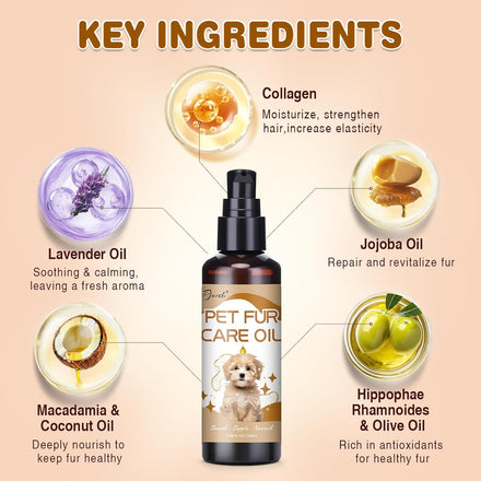 - Shiny & Smooth Coat: This fur care oil contains macadamia oil and coconut oil, which help smooth and enhance the natural shine of your pet's fur, making it softer and easier to comb while creating a sleek, healthy appearance.