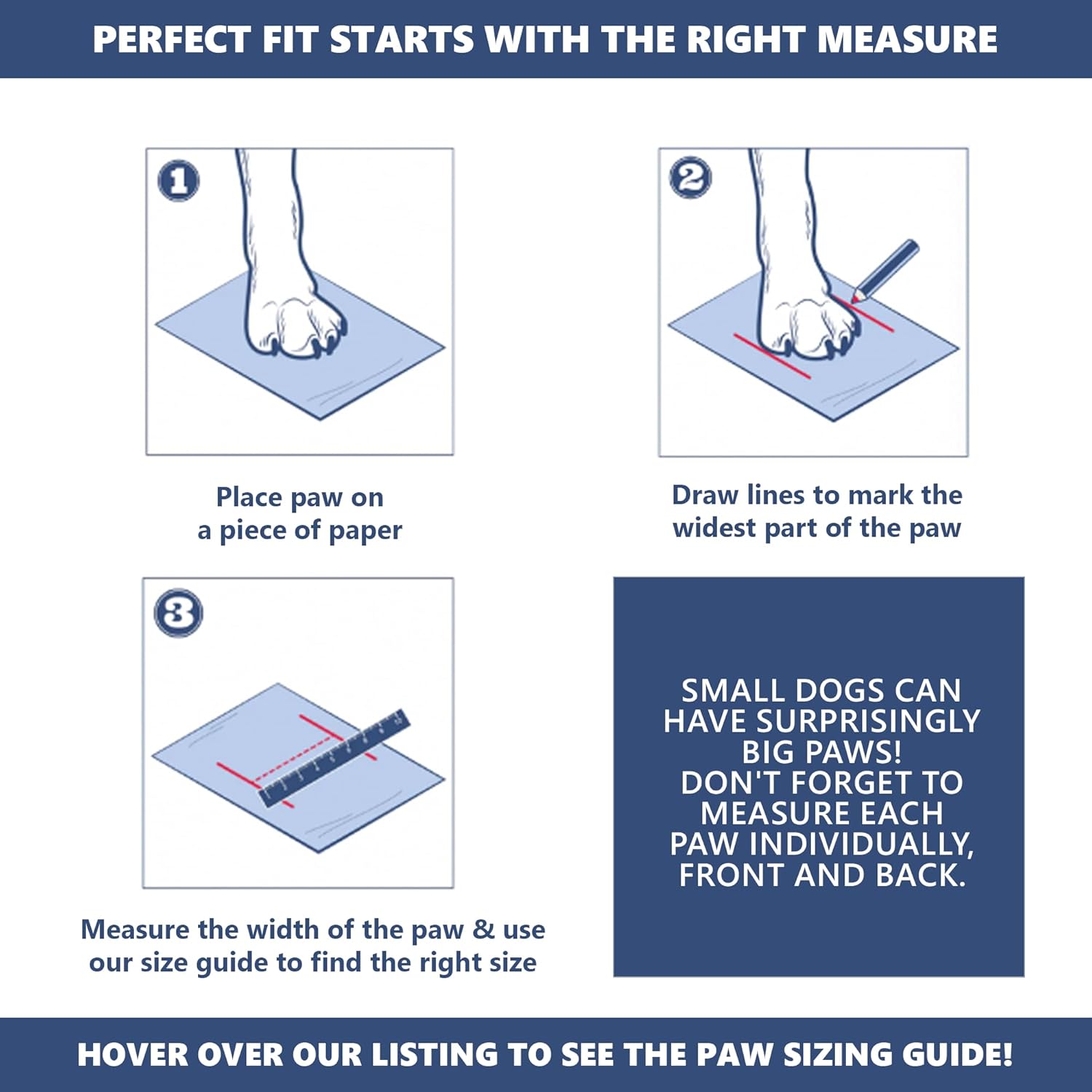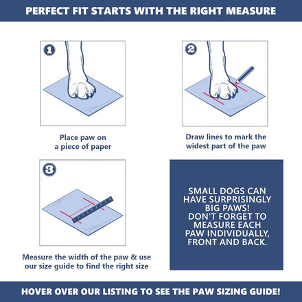 • Measure Dog Paw Width: Size A: 1.6"x1.9"(W*L) for 13-23 lbs | Size B: 2.0"x2.4"(W*L) for 23-33 lbs | Size C: 2.4"x2.8"(W*L) for 40-60 lb | Size D: 2.6"x3.0"(W*L) for 50-70 lbs | Size E: 3.0"x3.5"(W*L) for 75-100 lbs