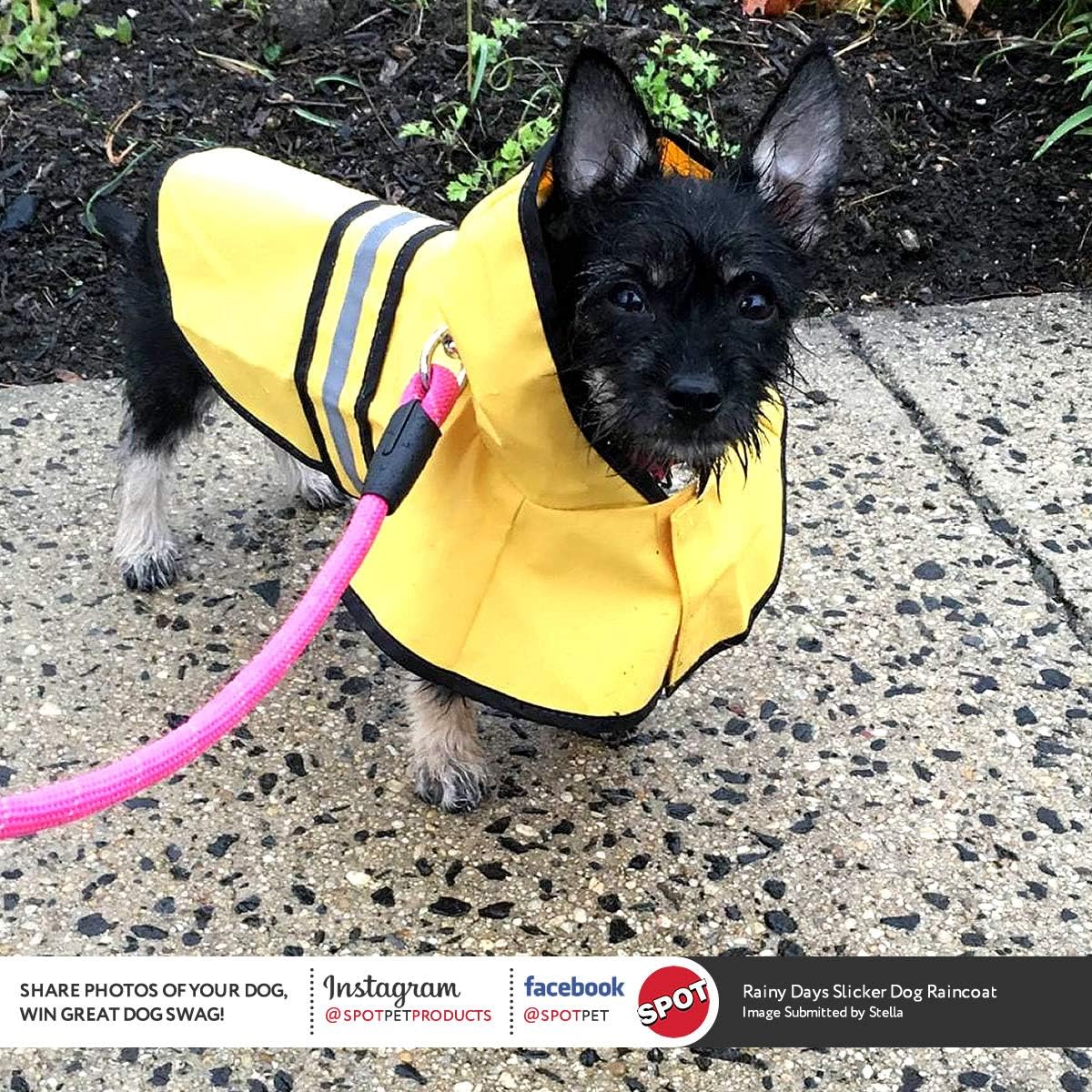 Protect your dog from cold and rainy weather with a full coverage comfortable raincoat. Whether you're a dog owner, a pet sitter or a dog lover, its important to keep your fluffy friends safe and warm while outdoors; especially when its rainy, cold or snowy. Safety meets functionality We created SPOT dog raincoats to protect your pup in the rain, the snow, and for any other time your dog may need outdoor protection. Designed comfortably in a vibrant yellow color with safety reflective stripes and a full coverage hood, our raincoat allows your dog to enjoy being outdoors regardless of the weather conditions. So grab your ball and go play fetch; we'll protect your dog so you can focus on giving your dog some much needed fun and his/her daily dose of exercise. Product details: Bright yellow with grey reflective stripes Lightweight, soft, comfortable and warm Waterproof Coat that is easy to clean Leash hole on back Adjustable velcro belly and chest straps to make the fit just right Full coverage hood 100. rain jacket, rain poncho or slicker. Whether your dog is big or small, a Maltese, pitbull, bulldog, dachshund, doberman, yorkie, german shepherd, greyhound, golden retriever, labrador, chihuahua or any other breed, there is a size for you. So rainproof your outdoor excursions, today and never let the cold weather keep your dog from playtime and walks again. Don't forget your umbrella for yourself.