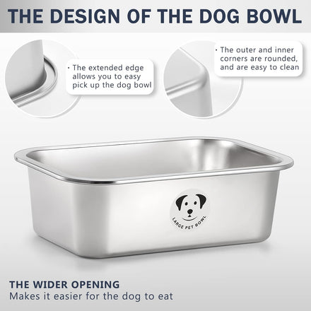 - Large Capacity: The stainless steel metal dog bowl is specially designed for large, X-large, and huge dog breeds. The L dog bowl holds 1.25 US gallons (4731ml), and the XL holds 2.65 US gallons (10031ml). 1 bowl can be used for two feed as dog food bowl and water bowl.