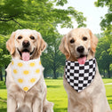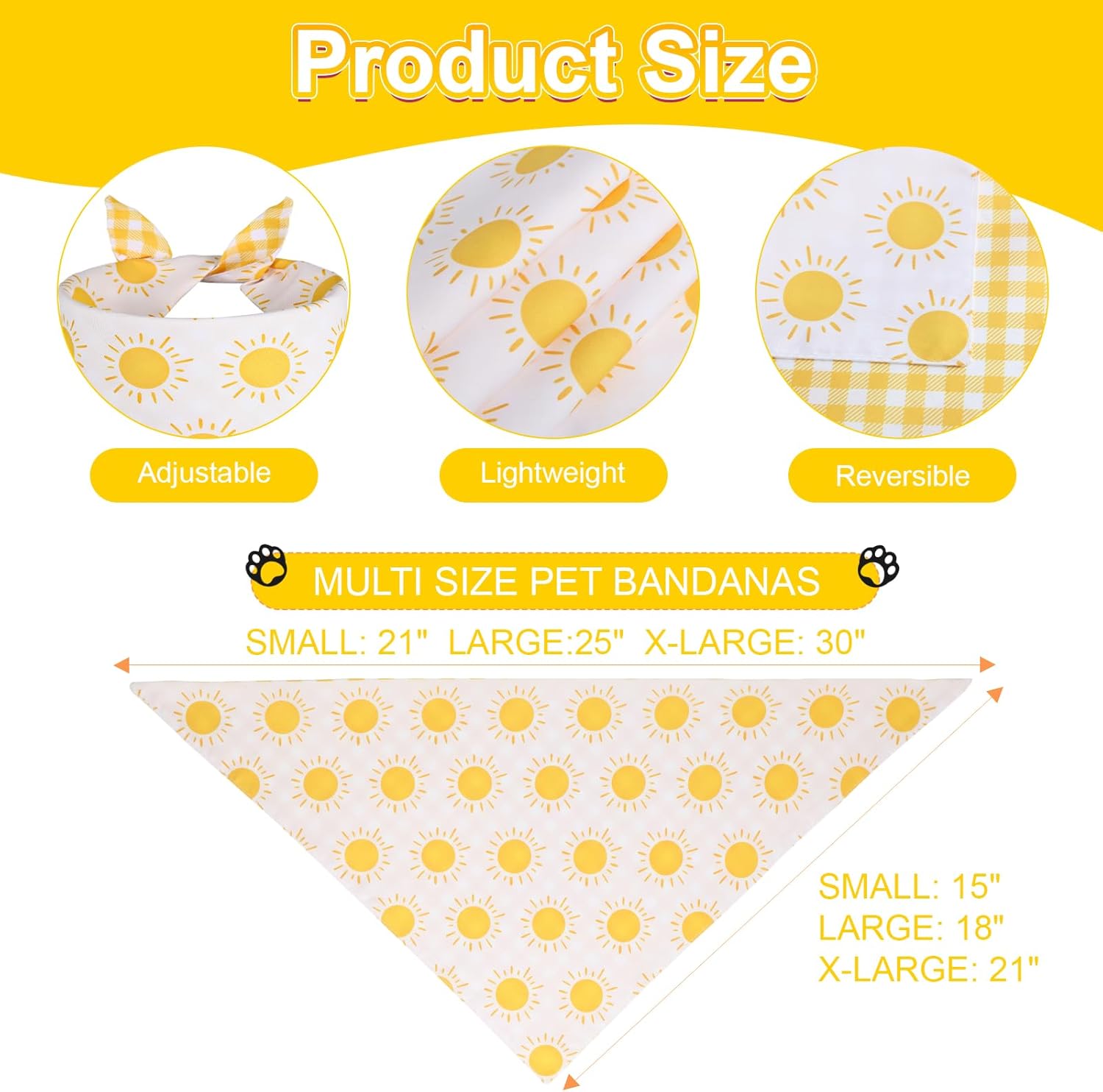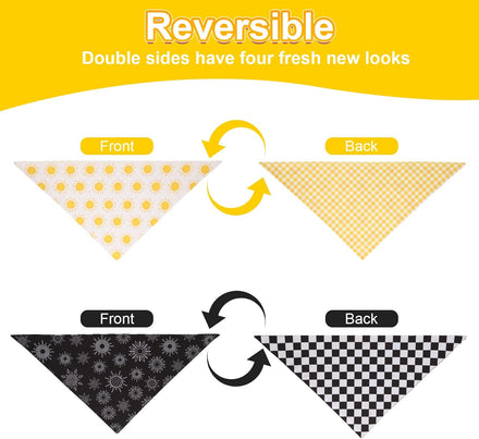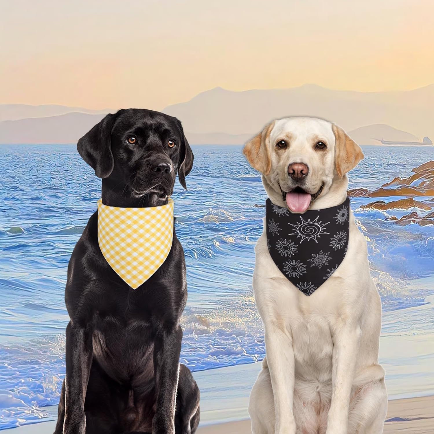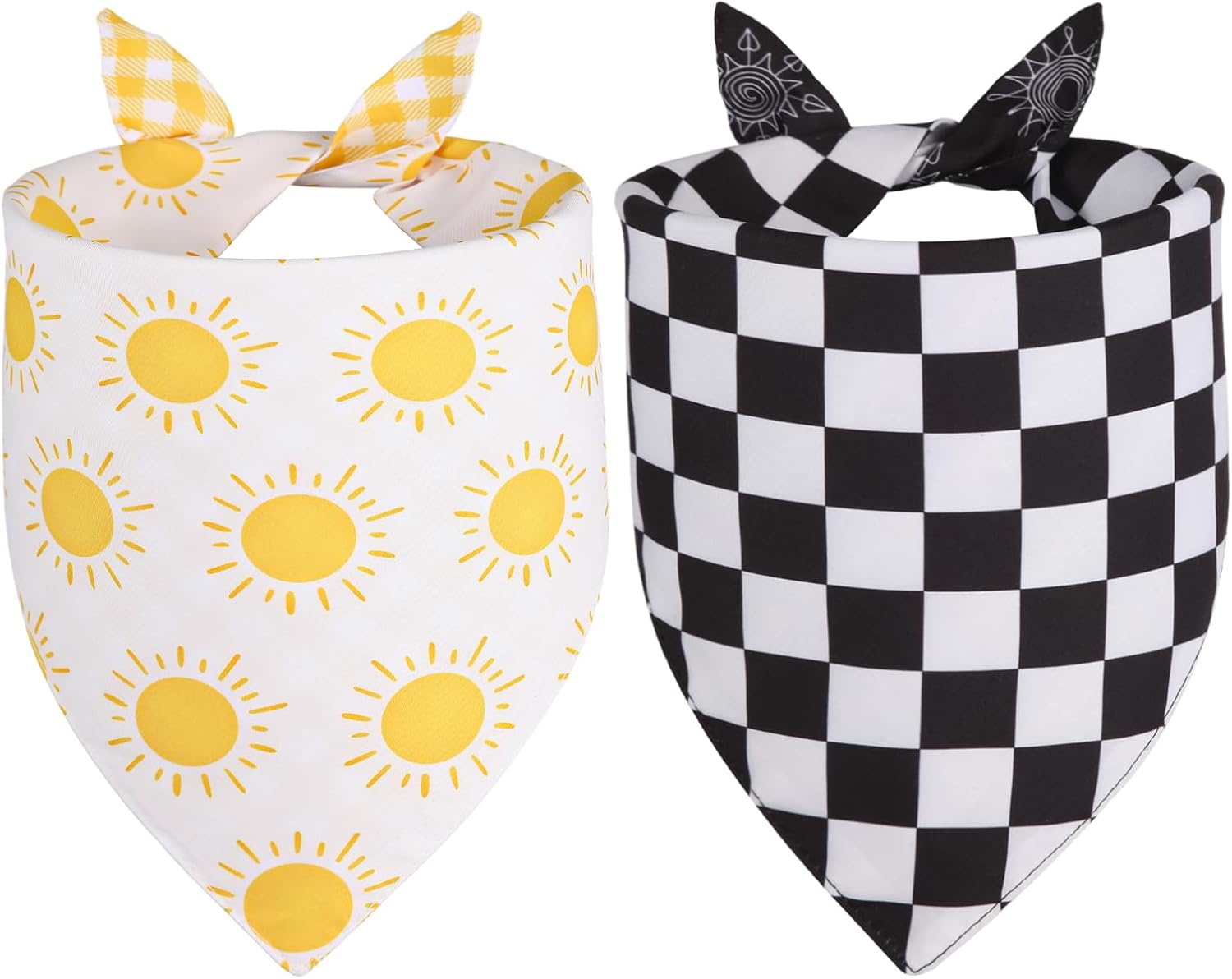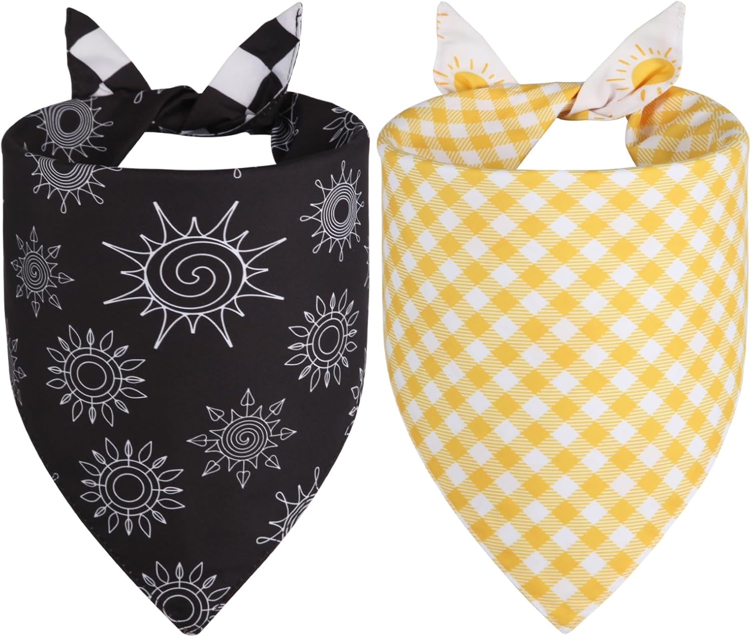 - Interesting Design: They all has two different sides, the design of one scarf: one side with golden suns, and the other side with small yellow white grids; The design of the other : one side is black with various shapes of the suns , and the other side has a black and white checkerboard grid pattern, 2PCS have 4 fresh new looks, it is very interesting and cheerful, it's perfect for holiday, spring and summer, let's make your pet show lovely.