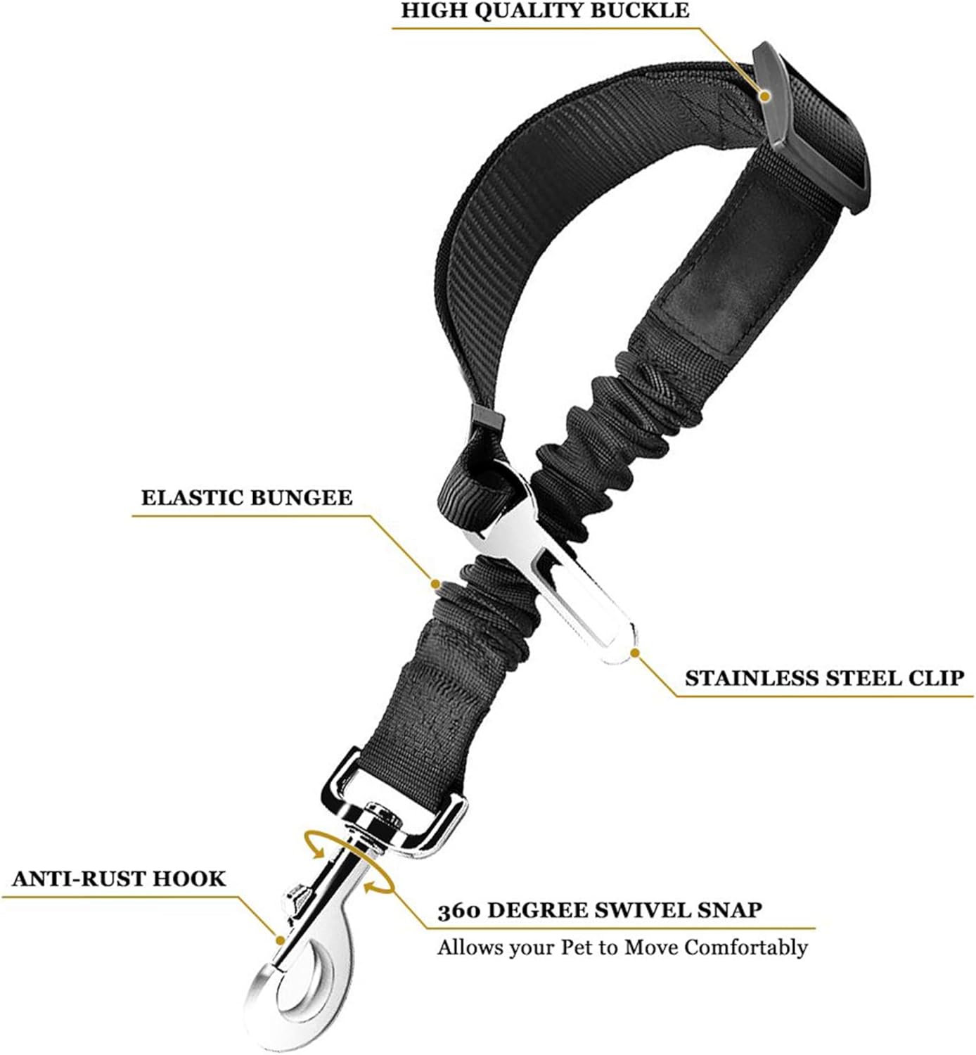 - Keeps Dog Restrained & Secure --- As your pooch doesn’t have the same gripping ability as humans, this reliable with the state-of-the-art technology can restrain his movements and help maintain stability inside the car. Its high-class swivel snap and metal buckles made from solid zinc alloy don’t loosen over time, which gives your friend complete security in case of sudden stop or occurrence of an adverse incident. You’ll be assured that he won’t be thrown off the seat.